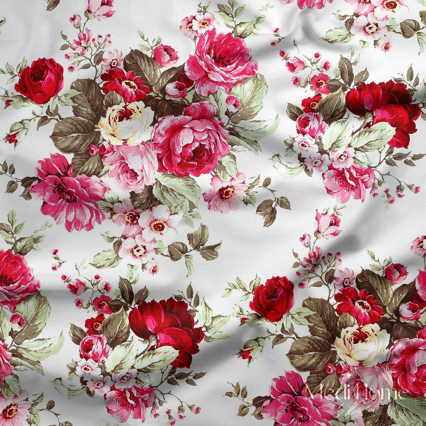 Açık bej-krem tonlarındaki yumuşak zeminde yükselen fuşya, bordo ve beyaz güller. Bu desen, klasik bir gül bahçesinin en zarif anlarını kumaşa taşıyor. Büyük ve dolgun çiçek buketleri yapraklarla çevrelenmiş ve kumaş boyunca dengeli bir şekilde yayılmış. Açık zemin, desenin tüm renklerini parlatırken ortamınıza romantik ama ferah bir hava katıyor.