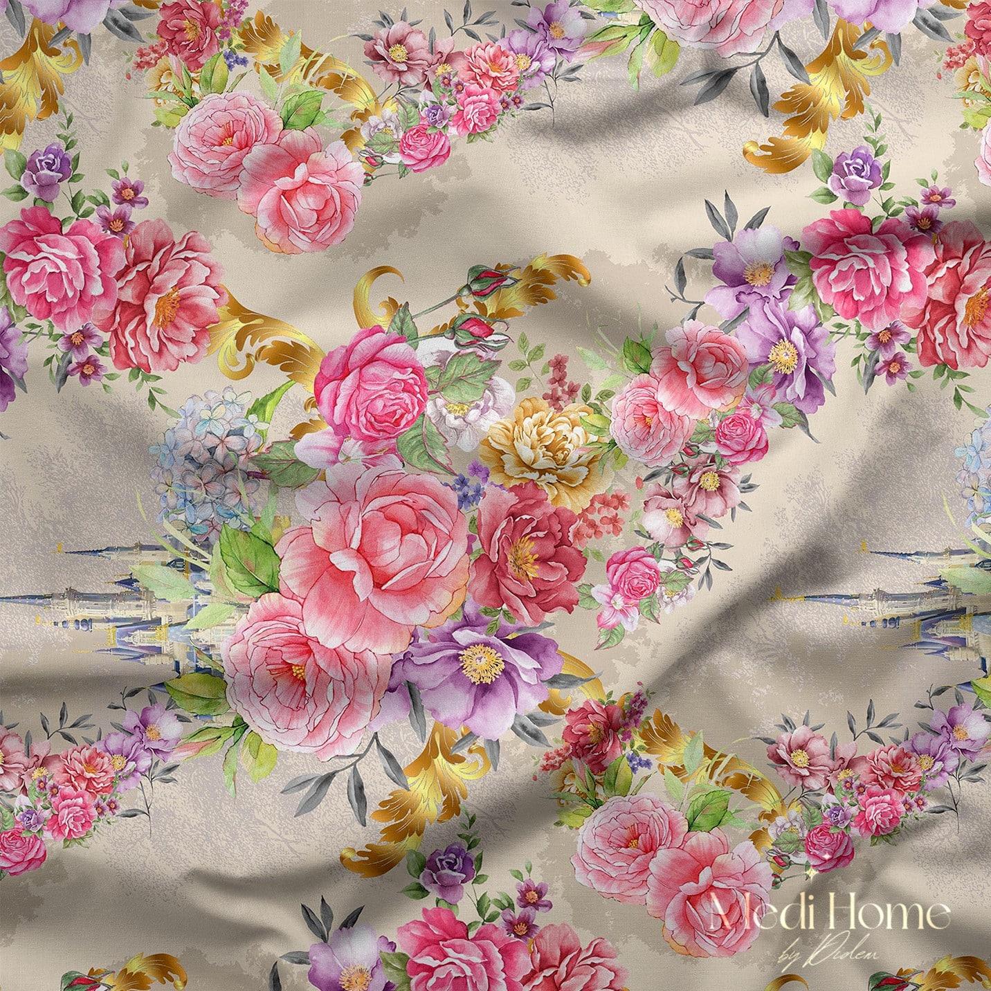 Sanki saraydan çıkmış bir buket.  Altın kıvrımların arasında dans eden pembe, mor ve lila tonlarındaki çiçekler, romantizmi ve ihtişamı aynı anda sunuyor. “Altın Dokunuşlarla Pembe Rüyalar” deseni; pastel bej zemin üzerinde akıp giden çiçek halkalarıyla adeta nostaljik bir tablo gibi.
