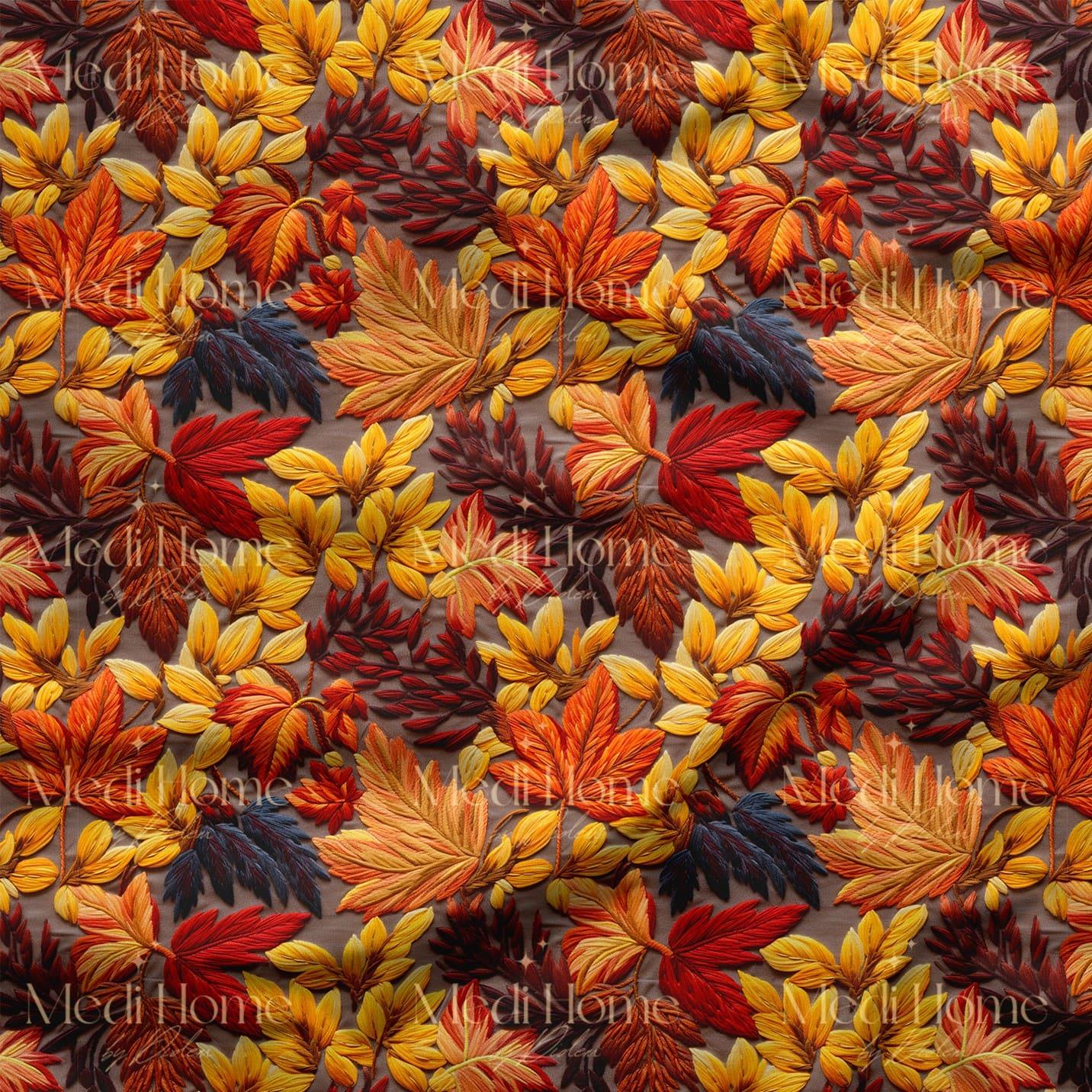 Yoğun sarı, turuncu, kızıl ve bordo tonlarının buluştuğu bu muhteşem desen, sonbaharın büyüleyici renk cümbüşünü evinize taşıyor. 3 boyutlu nakış efektli dokusuyla yaprakların damar detayları adeta canlıymış gibi hissedilirken, zengin tonlar dekorlarınıza sıcak ve şık bir dokunuş katıyor.