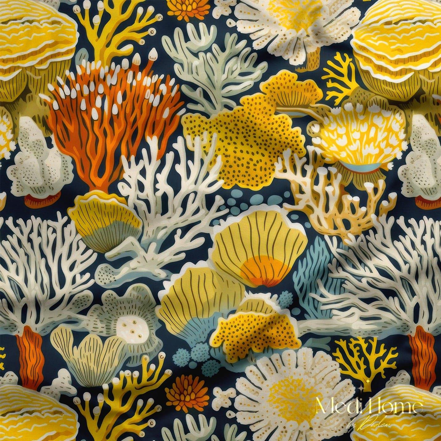 Okyanusların derinliklerindeki canlı mercan resiflerinden ilham alınarak tasarlanan bu desen, altın sarısı, turuncu, beyaz ve yumuşak yeşil tonlarını bir araya getiriyor. Koyu lacivert zemin üzerinde parlayan mercan detayları, adeta suyun altındaki hayatın ritmini yansıtıyor.