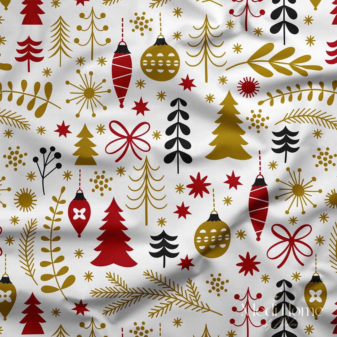 Kırmızı ve altının göz kamaştırıcı buluşmasıyla yılbaşı ruhunu evinize taşıyan bu desen, modern ve minimal bir şıklık sunuyor. Zarif çam dalları, stilize ağaçlar ve ışıldayan süslerle bütünleşen tasarım, hem nostaljik bir sıcaklık hem de modern bir zerafet katıyor. Dijital baskının canlılığıyla dekorasyonunuza göz alıcı bir dokunuş getiriyor.