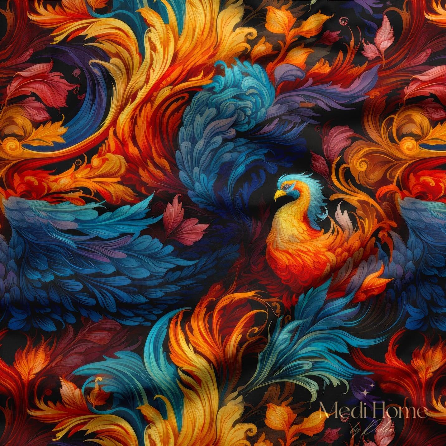 Göz alıcı kırmızılar, parlak maviler, altın sarıları ve morun büyüsü. Bu desen, mitolojik bir kuşun, ankanın küllerinden doğuşunu andırıyor. Siyah zemin üzerine yerleşmiş alev ve tüy formlu geçişler, güçlü bir hareket hissi yaratıyor.