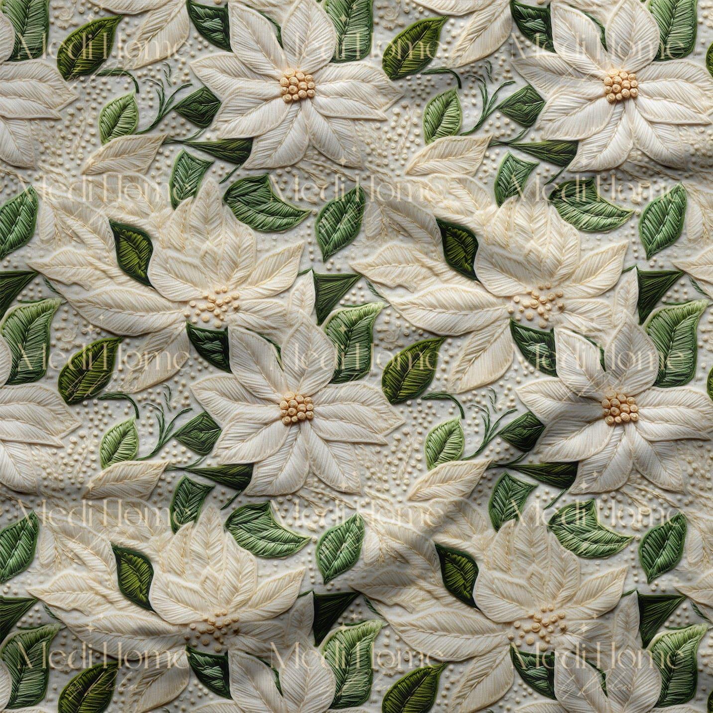 Beyaz Yılbaşı Çiçeklerinde Kışın Sessizliği Dijital Baskılı Kumaş