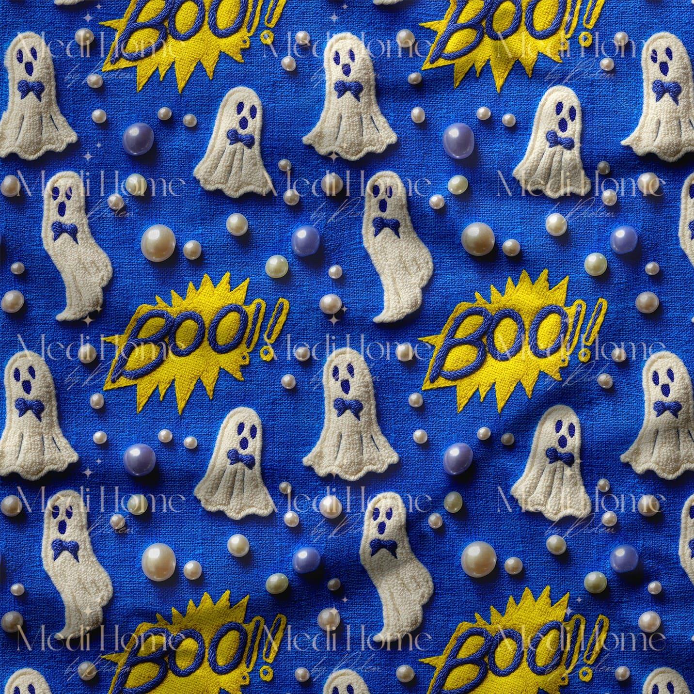 Canlı kobalt mavisi zemin üzerinde 3 boyutlu nakış efektli beyaz hayaletler, eğlenceli “BOO!” yazıları ve inci parlaklığında yuvarlak detaylarla buluşuyor. Her hayaletin boynundaki lacivert fiyonk, desene zarif bir kontrast ve eğlenceli bir hareket katıyor.