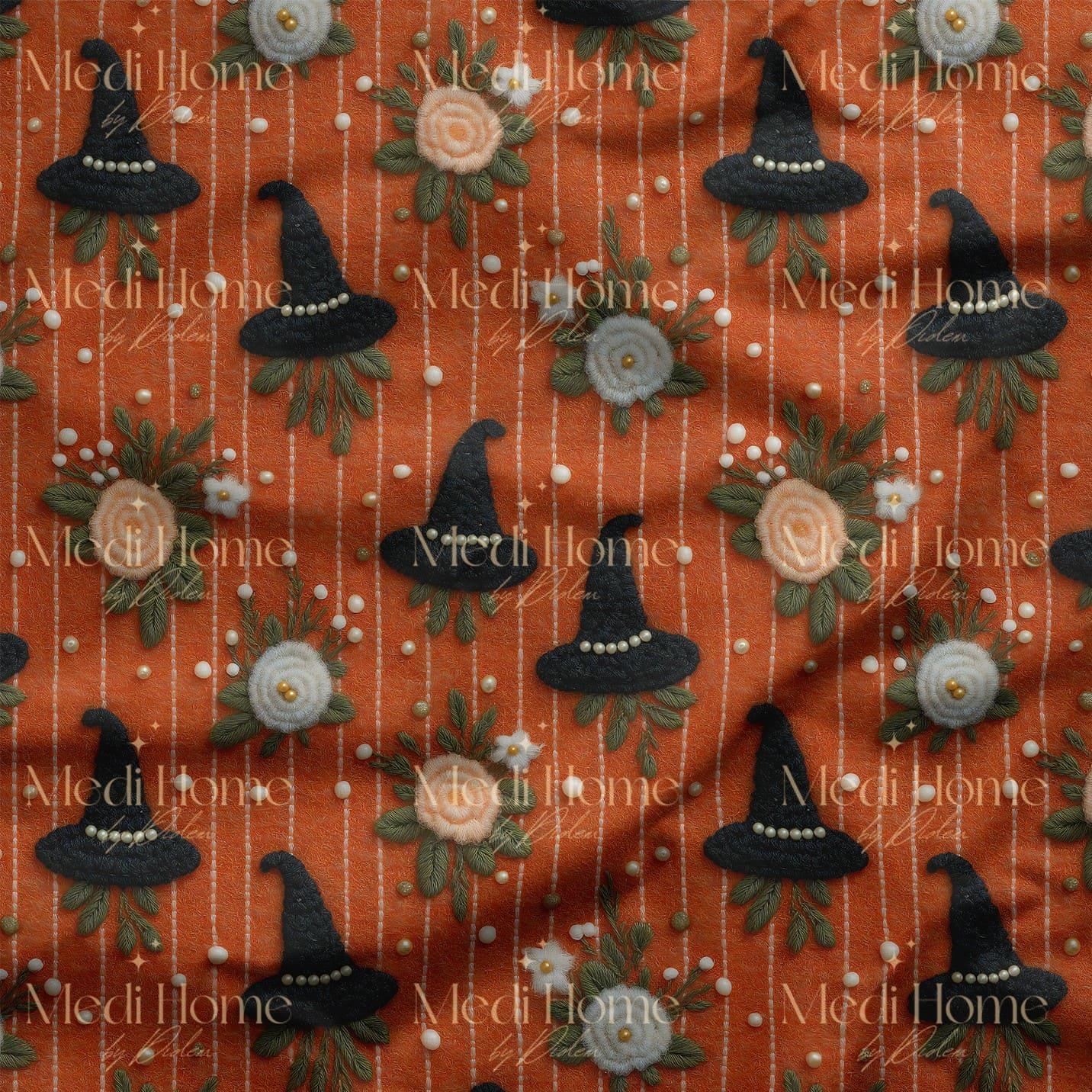 Canlı turuncu zemin üzerine işlenmiş, inci detaylı siyah büyücü şapkaları ve pastel tonlu 3 boyutlu çiçekler ile hazırlanmış bu desen, cadıların gizemli ruhunu romantik bir sonbahar zarafetiyle buluşturuyor. İnce beyaz çizgilerle hareket kazandırılan bu kumaş, dijital baskı tekniğiyle üretilmiş olup tok yapısı ve canlı renkleriyle göz alıcı bir dekoratif etki yaratıyor.