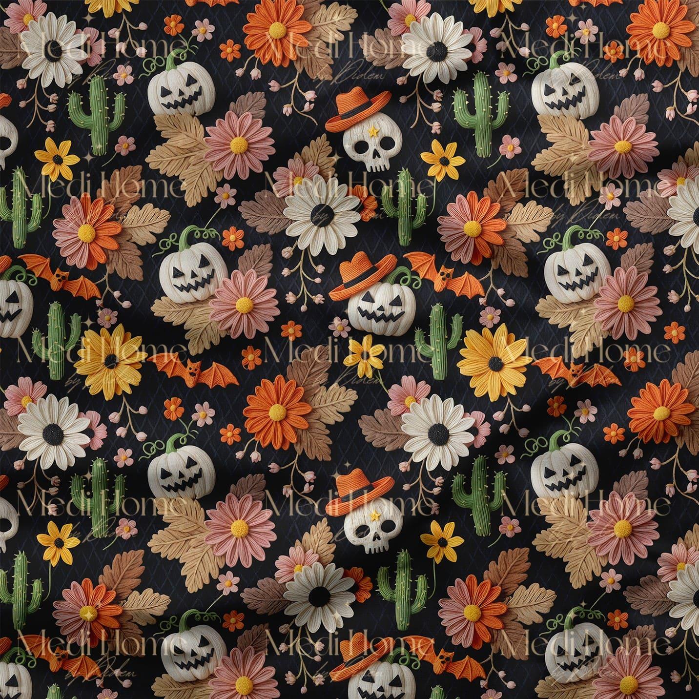 Cadılar Bayramında Çiçekli Kaktüsler Dijital Baskılı Kumaş (MB halloween 02)