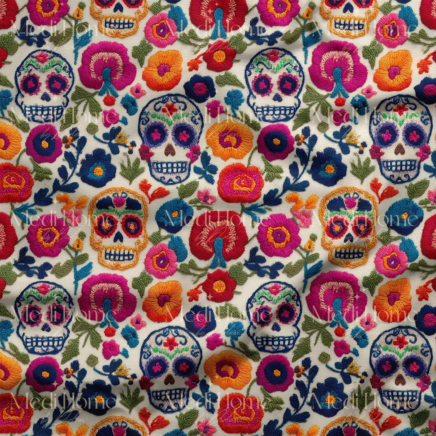 Canlı pembe, mor, turuncu, sarı ve lacivert tonlarının buluştuğu bu eğlenceli tasarım; Meksika’nın renkli “Día de los Muertos” (Ölüler Günü) ruhunu evinize taşıyor. Nakış efektli 3 boyutlu görünümü, çiçeklerle süslenmiş kafataslarını adeta el işçiliği dokusuyla sergiliyor. Sanatsal ve enerjik dekor projeleri için benzersiz bir tercih.