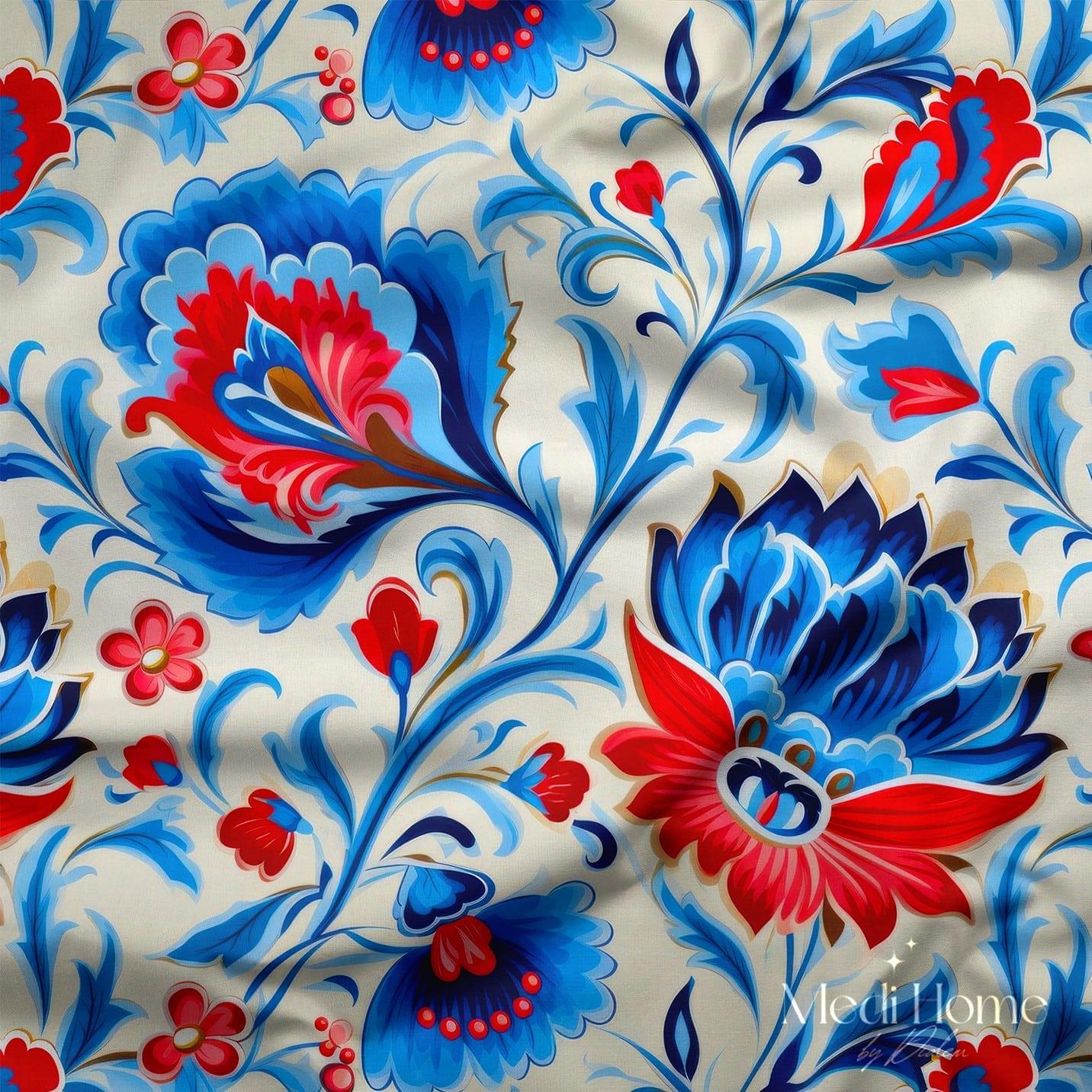 Klasik çini sanatının ruhu, modern tasarımla buluştu! Beyaz zemin üzerine işlenmiş yoğun kobalt mavi, nar kırmızısı ve lacivert tonlarıyla çiçeklerin adeta nakış gibi işlendiği bu desen; hem enerjik hem geleneksel. Özellikle etnik, folk veya oryantal temalı dekorasyonlarda iddialı bir atmosfer yaratmak isteyenler için birebir!