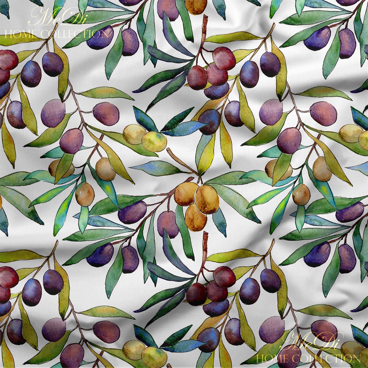 Beyaz zemin üzerine işlenmiş zarif zeytin dalları. Mor, yeşil ve siyah tonlarındaki zeytinler ile doğal yeşilin huzur veren yaprakları, Ege’nin bereketli topraklarından sofralarınıza gelen bir esinti gibi. Sade, şık ve zamansız bir tasarım arayanlar için mükemmel bir seçim.