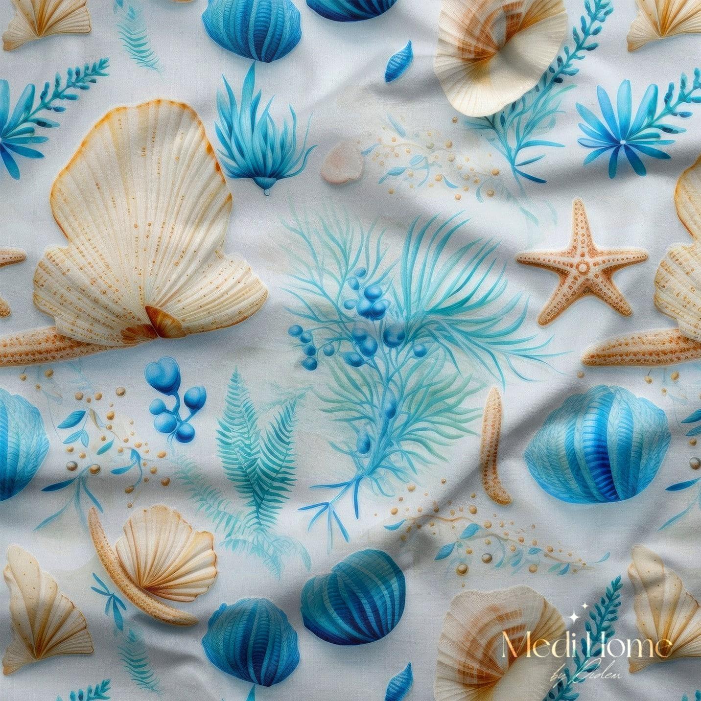 Beyaz zemin üzerinde mavi, turkuaz ve bej tonlarında deniz kabukları, yıldız balıkları ve zarif deniz bitkileri. Yazın huzurunu evinize taşıyan bir desen.