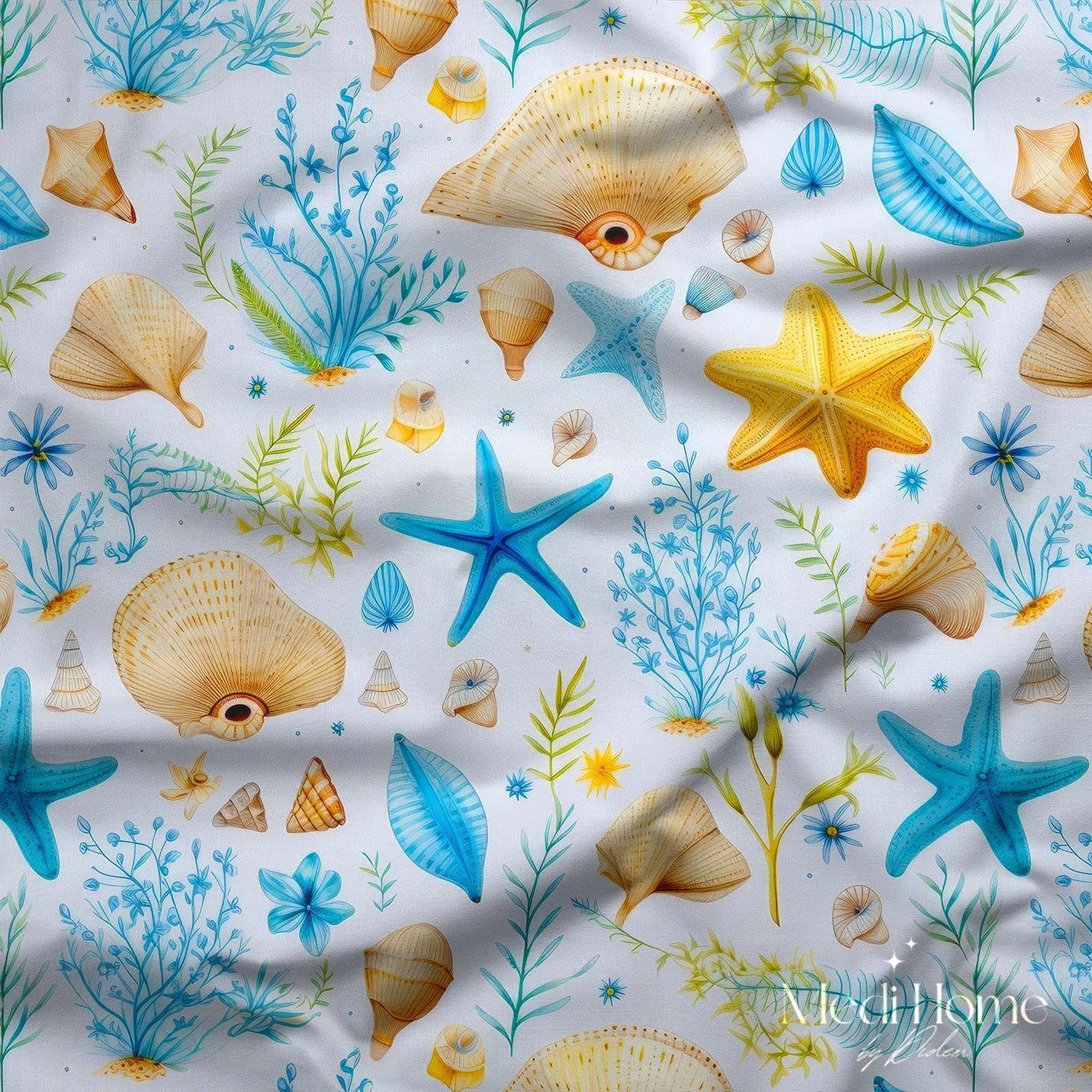 Turkuazdan sarıya, maviden beje uzanan pastel tonlarda yıldızlar, deniz kabukları, mercan dalları ve su bitkileri. Bu desen, yazın en tatlı anılarını kumaşın kalbinde saklıyor.