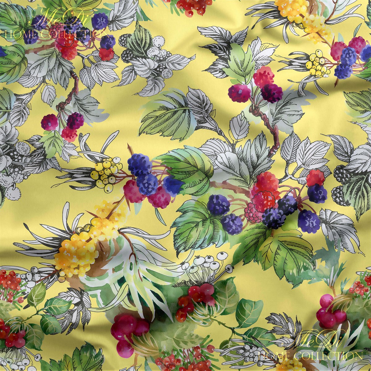 Sapsarı bir yaz sabahı gibi iç açıcı bu desen, olgunlaşmış dutların göz alıcı renkleriyle buluşuyor. Klasik illüstratif tarzdaki ince siyah konturlu yapraklar ve detaylı dut dalları, su gibi akan bir renk şöleniyle birleşiyor. Her bir meyve, canlı mor, fuşya, kırmızı ve sarı tonlarıyla sanki taptaze koparılmış gibi duruyor.