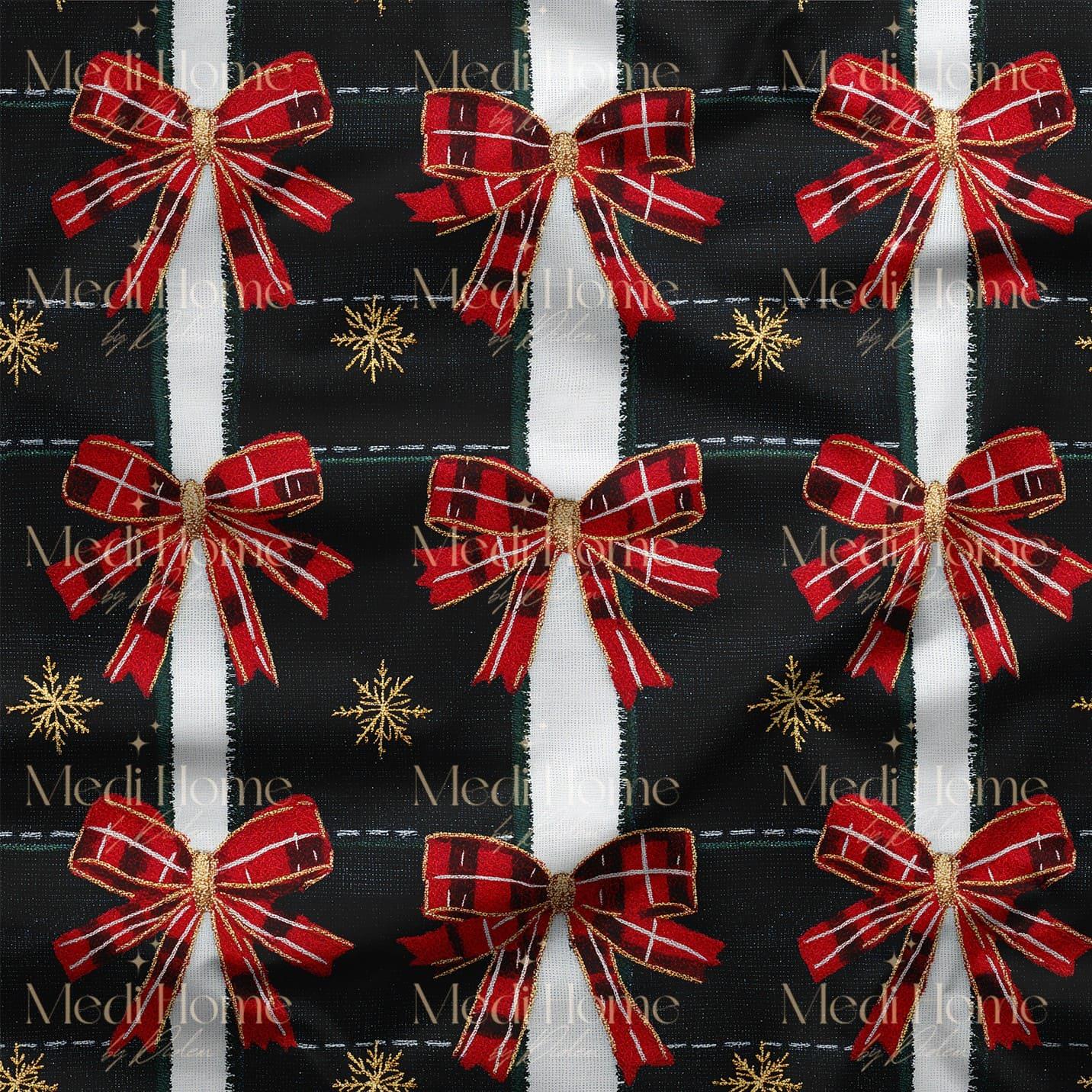 Siyah ekose zemin üzerinde inci beyazı şeritler ve kırmızı ekose fiyonkların göz alıcı birleşimi. Altın yıldız motifleriyle süslenen bu desen, yılbaşı coşkusunu ve kış zarafetini aynı anda yansıtıyor. Nakış efektli 3 boyutlu baskı sayesinde fiyonklar adeta kumaşın üzerinde bağlanmış gibi canlı bir görünüme sahip. Tok mikropetek dokuma polyester yapısı, hem şık masa örtüleri hem de dekoratif kırlentler için dayanıklı ve estetik bir seçim.