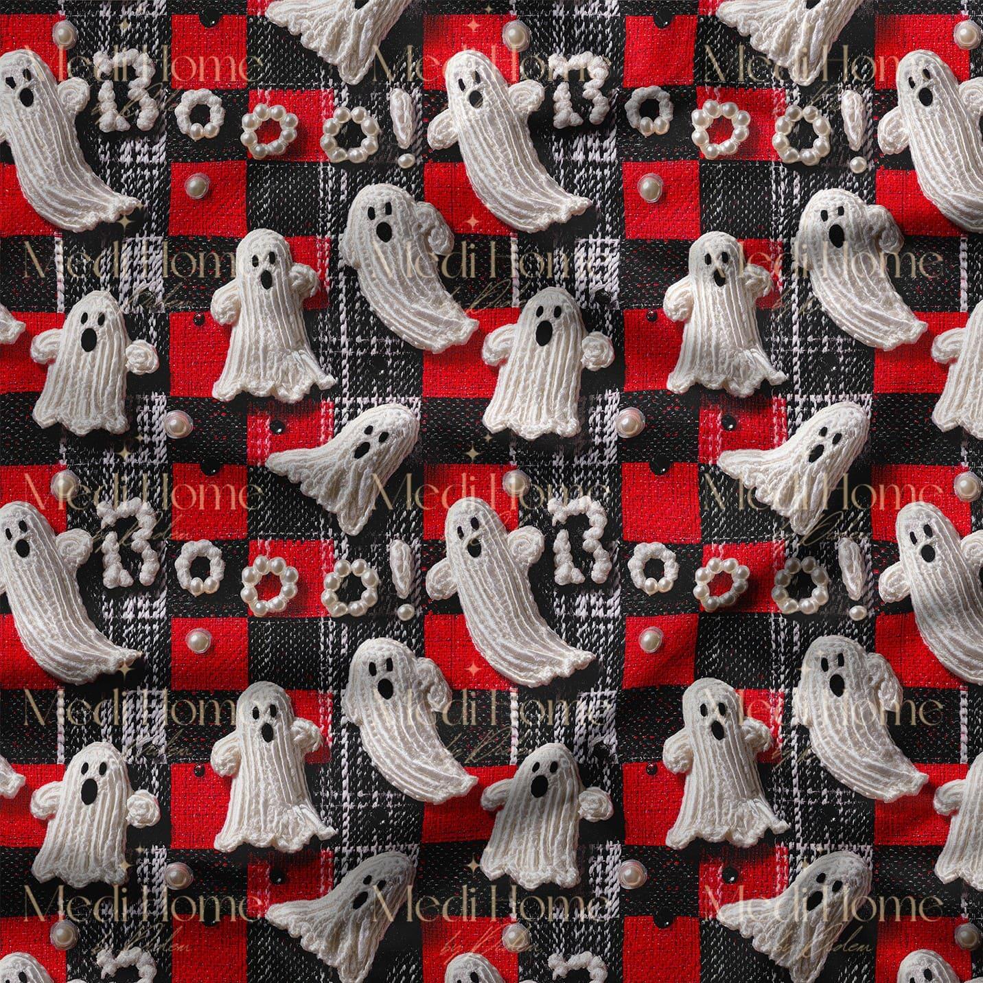 Klasik kırmızı-siyah ekose zemin üzerinde 3 boyutlu nakış efektli beyaz hayaletler, enerjik ve eğlenceli bir atmosfer yaratıyor. İnce beyaz çiçek ve inci dokunuşlarıyla zenginleşen desen, hem rustik hem de modern dekorlarda etkileyici bir vurgu sunuyor.