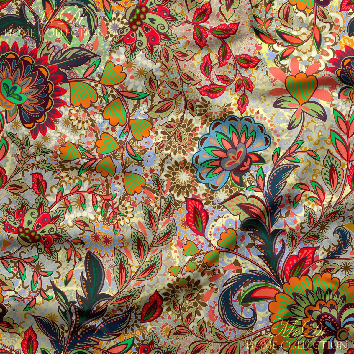 Bej ve altın tonlarının zarif zemininde açan rengârenk etnik çiçekler, kıvrımlı yapraklar ve zarif motiflerle birleşiyor. Bu kumaş, geleneksel desenlerin modern yorumunu sunuyor. Işıltılı yapısı ve detaylı çizgileriyle dikkat çekici ve enerjik bir atmosfer yaratıyor.