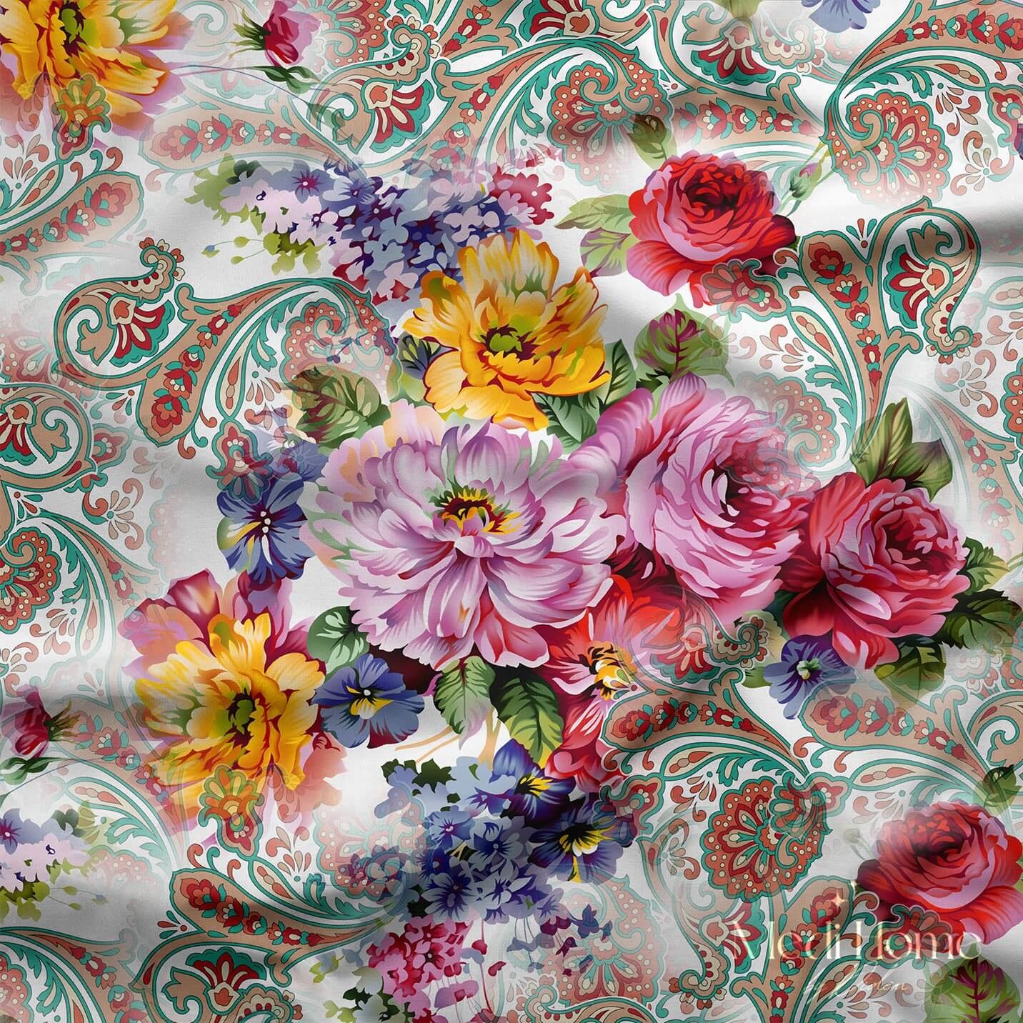 Pastel beyaz zemin üzerine işlenen zarif etnik motifler, adeta bir bahar sabahının ince esintisi gibi. Kırmızı, pembe ve mor güllerin, sarı şakayıkların ve papatyaların canlı dansı bu desende hayat buluyor. Renklerin parlaklığıyla desenin derinliği birleşince ortaya hem klasik hem etnik bir şiir gibi bir kumaş çıkıyor.