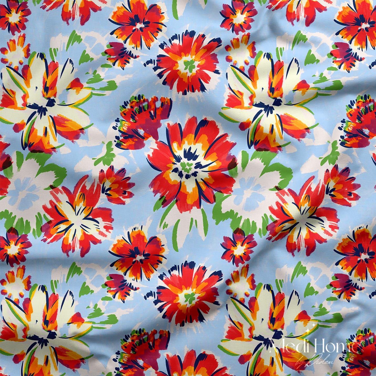 Canlı bir mavi fon üzerine serpiştirilmiş kırmızı, sarı ve turuncu tonlarında çiçekler. Adeta bir sanatçının paletinden fırlamış gibi! El boyaması hissi veren bu desen; özgür ruhlu, cesur ve enerjik bir etki yaratıyor.