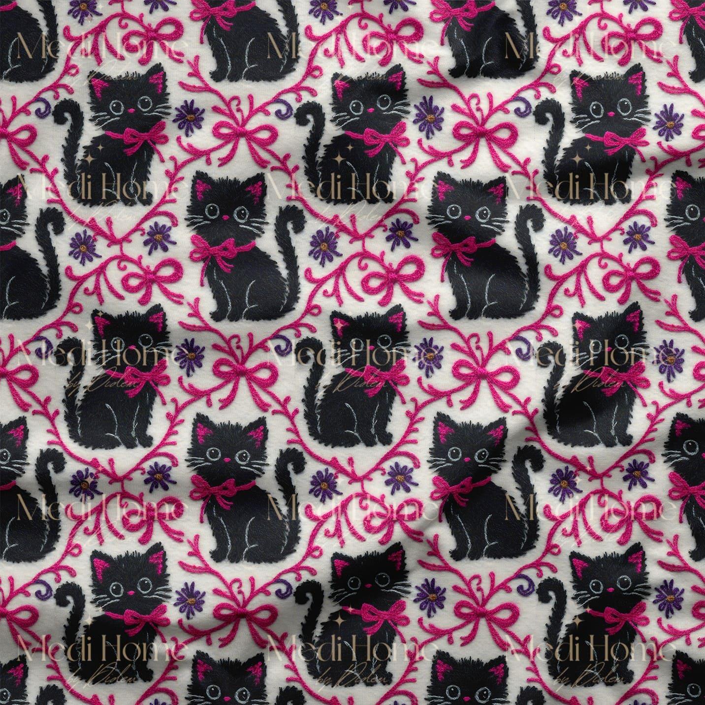 Beyaz zemin üzerine yerleştirilmiş sevimli siyah kediler ve fuşya fiyonk motifleri. Nakış efektli 3 boyutlu baskı tekniğiyle hazırlanan bu kumaş, siyahın asaleti ve pembe detayların enerjisiyle buluşuyor.