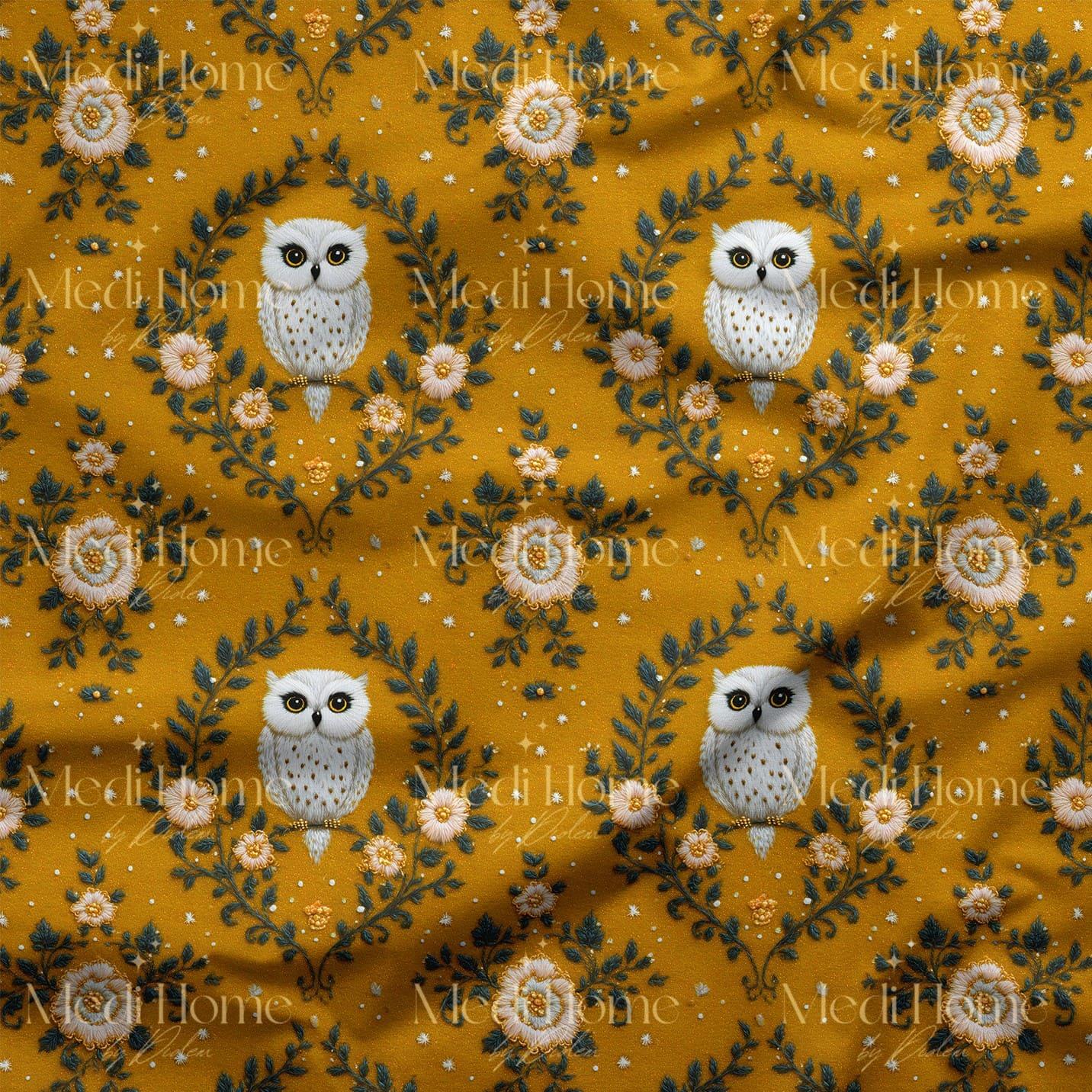 Sarı-hardal zemin üzerinde parlayan zarif beyaz baykuşlar, gece bahçesinin gizemli ışıltısını kumaşa taşıyor. Çevresini saran koyu yeşil dallar, krem ve altın tonlu çiçeklerle bütünleşerek romantik bir gece masalını andırıyor. Nakış efektli 3 boyutlu baskı tekniği sayesinde baykuşlar ve çiçekler adeta kumaşın üzerinde canlıymış gibi duruyor.