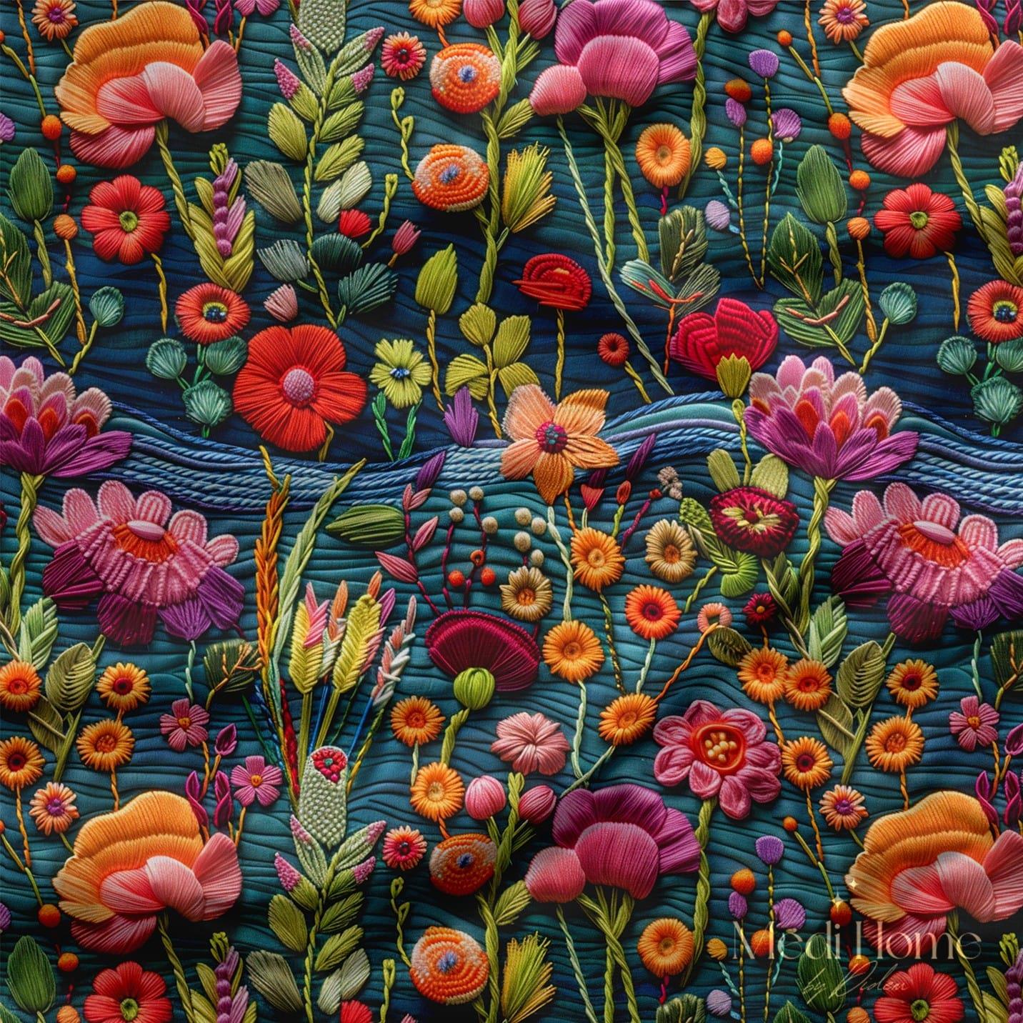 Gece Bahçesinde Renkli Nakışlar Dijital Baskılı Kumaş (Embriodery 9)