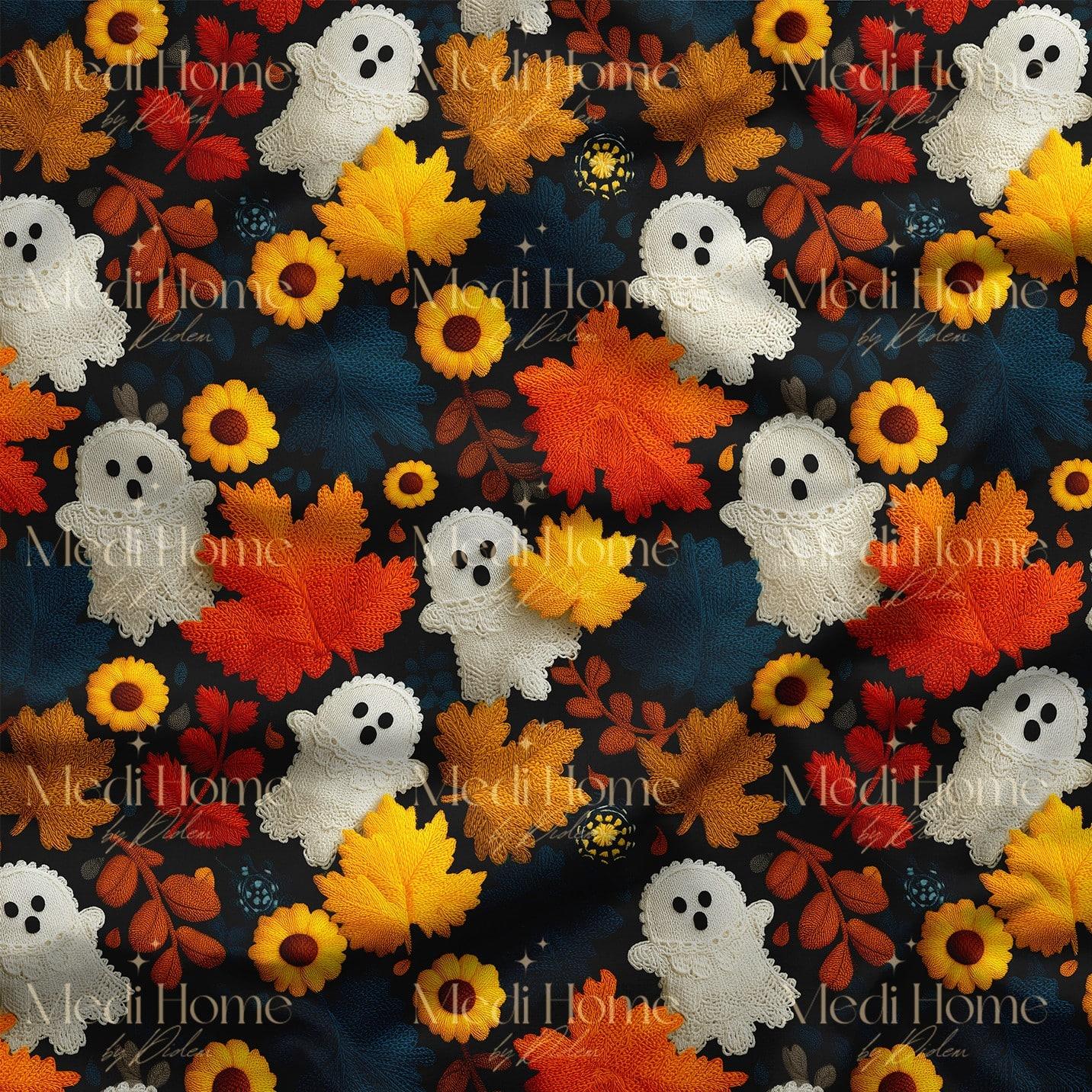 Koyu lacivert gece tonlarıyla bezeli bu büyüleyici desen, 3 boyutlu nakış efektli beyaz hayaletleri canlı sonbahar yaprakları ve güneş gibi parlayan sarı papatyalarla bir araya getiriyor. Parlak kırmızı, turuncu ve altın sarısı yaprakların sıcaklığı, gece mavisinin derinliğiyle kontrast oluşturarak göz alıcı bir sonbahar masalı yaratıyor.