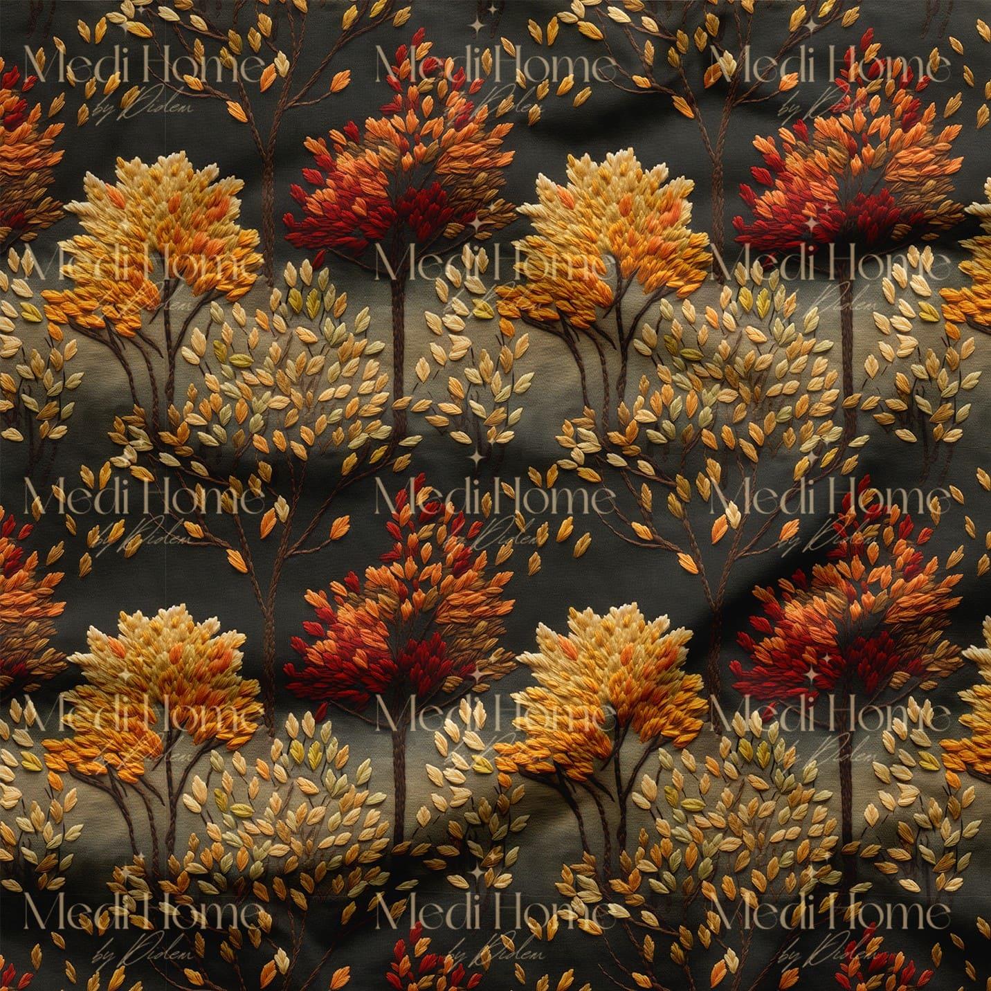 Koyu gece zemininde altın, kehribar ve kızıl tonlardaki ağaçların 3 boyutlu nakış efektli dokusuyla sonbaharın büyüsünü evinize taşıyın. Derin siyahın fon oluşturduğu bu canlı tasarım, doğanın zengin renk paletini dramatik bir şıklıkla sunuyor.