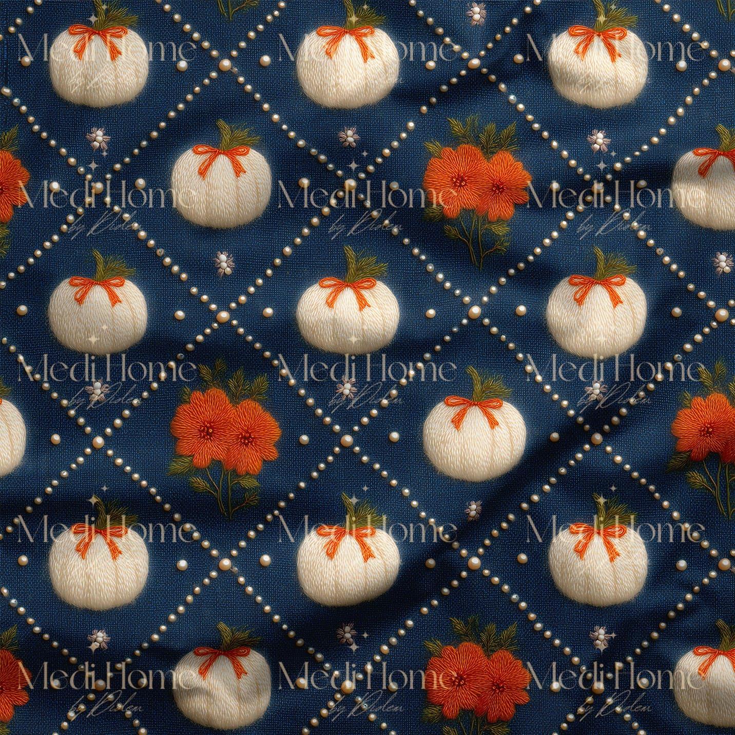 Derin lacivert fon üzerine el işi hissi veren inci şeritlerle karelenmiş alanda, kırmızı kurdeleyle süslenmiş zarif beyaz balkabakları ve ateş kırmızısı çiçekler romantik bir sonbahar gecesini anımsatıyor. 3 boyutlu nakış efektli görünümüyle desen, göz alıcı bir sofistike dokunuş sunuyor.