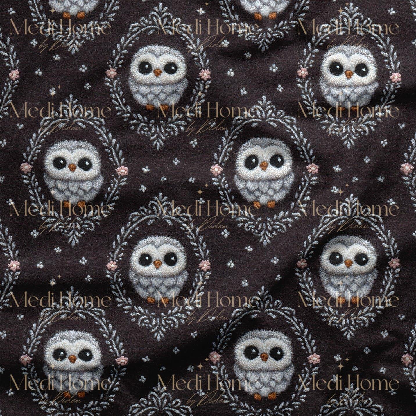 Siyah gece fonu üzerinde zarif çiçek dallarıyla çevrelenmiş sevimli baykuşlar, kumaşa gizemli ve masalsı bir şıklık kazandırıyor. Nakış efektli 3 boyutlu baskı, baykuşların tüy detaylarını ve çiçek çerçevelerini adeta el işçiliğiyle işlenmiş gibi öne çıkarıyor. Gece manzarasının büyüsünü evinize taşıyan bu tasarım, dekoratif projeleriniz için sofistike bir seçim sunar.