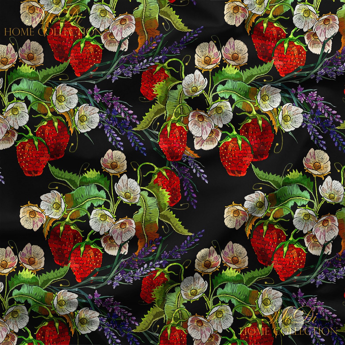 Siyah bir fonun üzerinde, goblen dokulu gibi görünen parlak kırmızı çilekler, lavanta dalları ve zarif beyaz çiçekler. Adeta eski zamanların el işi tablolarından çıkmış gibi! Bu desen, hem nostaljik hem de çarpıcı bir etki yaratıyor.