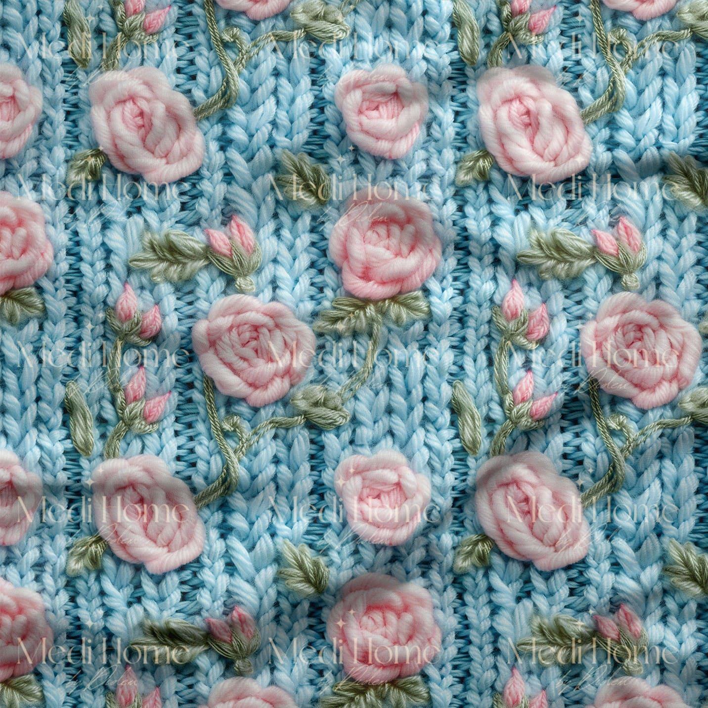 Gökyüzü mavisi örgü dokusunun ferah tonları üzerine zarif pudra pembesi güllerin üç boyutlu nakış efektiyle işlendiği bu kumaş, hem romantik hem de taptaze bir görünüm sunuyor. Yumuşacık his ve göz alıcı canlılık kazandırıyor.