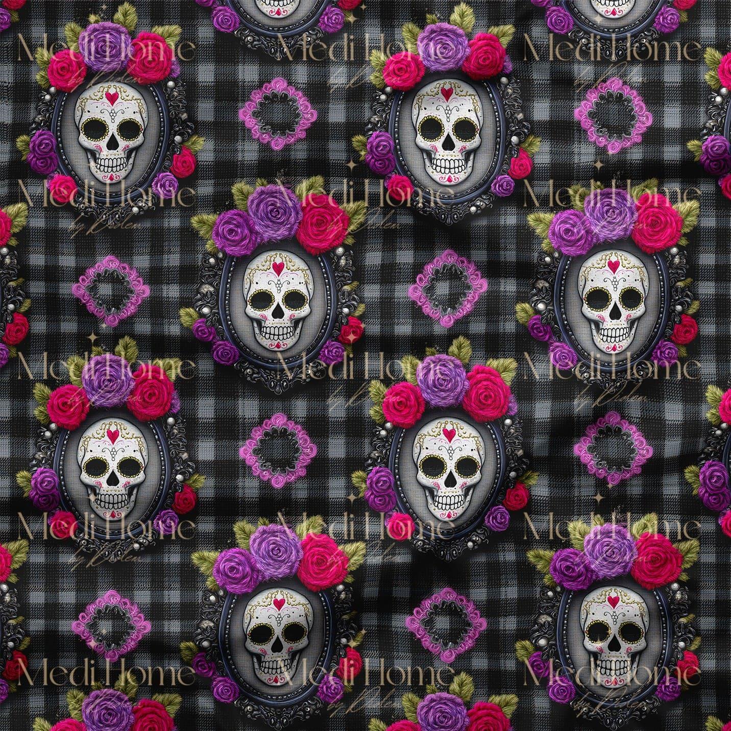 Güllerle Süslenmiş Gotik Çerçevedeki Şeker Kafatasları Dijital Baskılı Kumaş (Untitled_Artwork 1860)