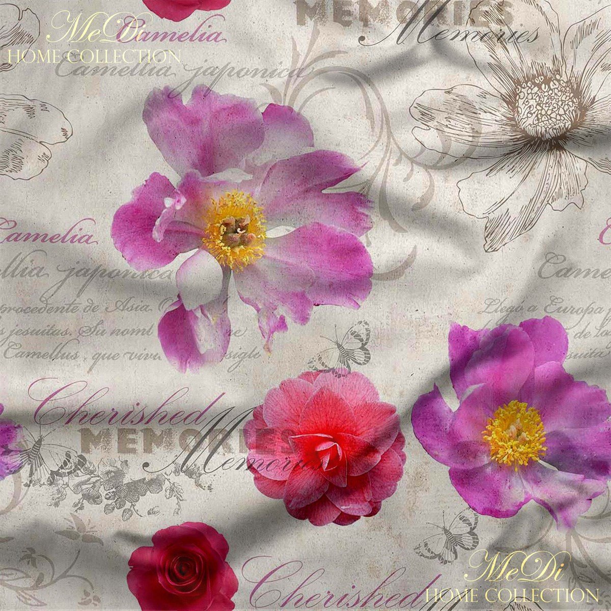 Zarif yazılarla bezenmiş bu romantik zeminde; pembe, kırmızı ve mor tonlarındaki çiçekler adeta geçmişe yazılmış bir şiir gibi açıyor. “Hatıralarla Açan Çiçekler” deseni, hem modern hem vintage dekorasyonlara uyum sağlayan duygusal bir şıklık sunuyor.