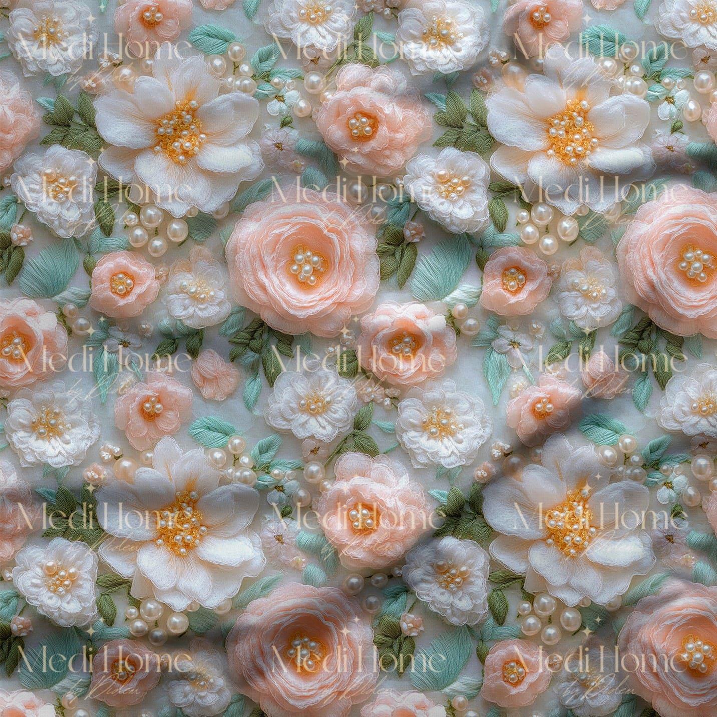 Pastel tonların huzur veren dünyasına açılan bu tasarım, inci tanelerini andıran kabartmalı dokularıyla bezenmiş krem, pudra ve şeftali tonlarında çiçekleri su yeşili yapraklarla buluşturuyor. 3 boyutlu nakış efektli dokusu sayesinde çiçekler sanki kumaşın üzerinden yükseliyormuş hissi yaratıyor.
