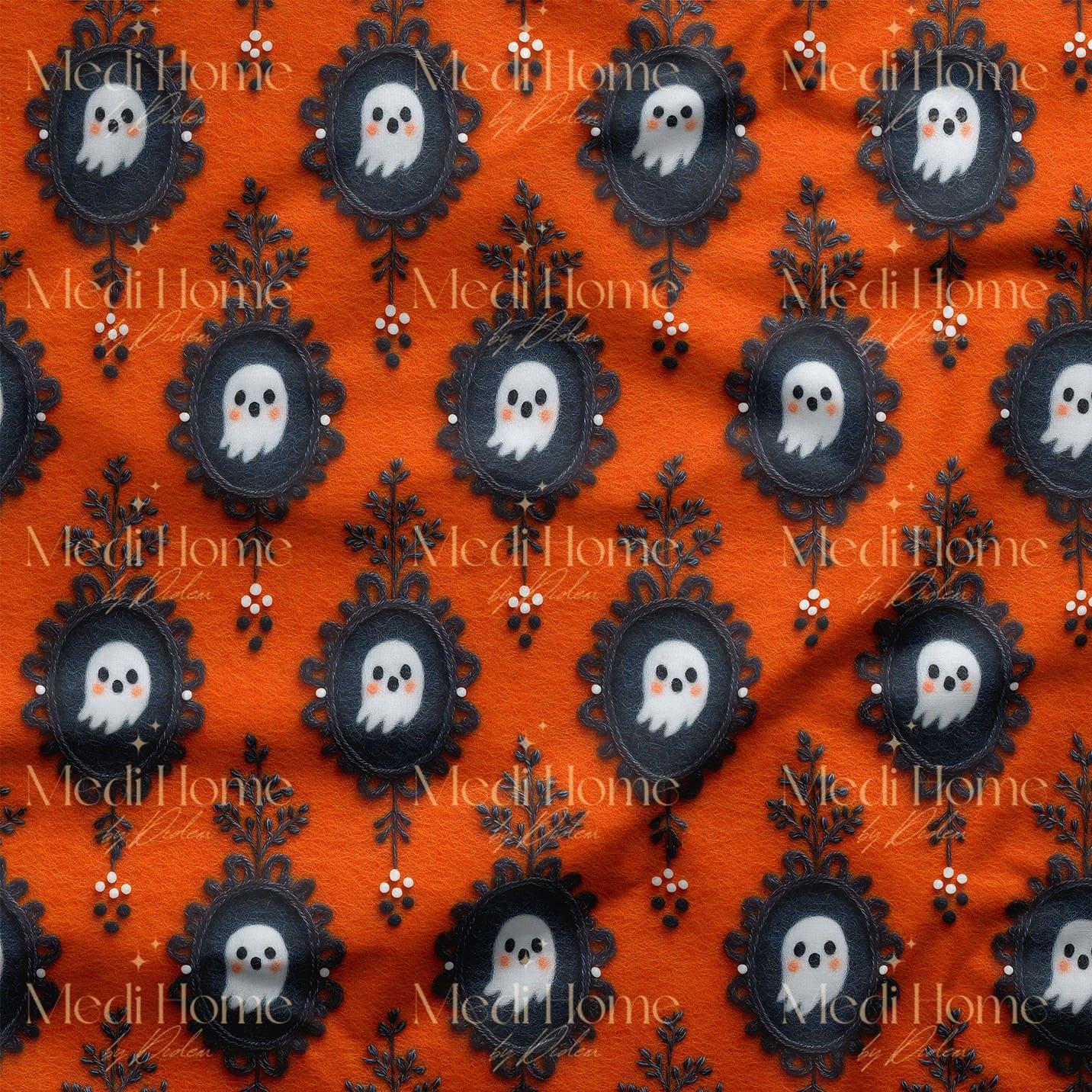 Parlak turuncu zemin üzerinde zarif siyah çerçeveler içinde yer alan minik beyaz hayaletler, 3 boyutlu nakış efektli dokusuyla kumaşa eğlenceli ve sofistike bir hava katıyor. Siyah ve beyazın kontrastı, turuncunun canlı enerjisiyle buluşarak hem şık hem de neşeli bir dekoratif etki yaratıyor.