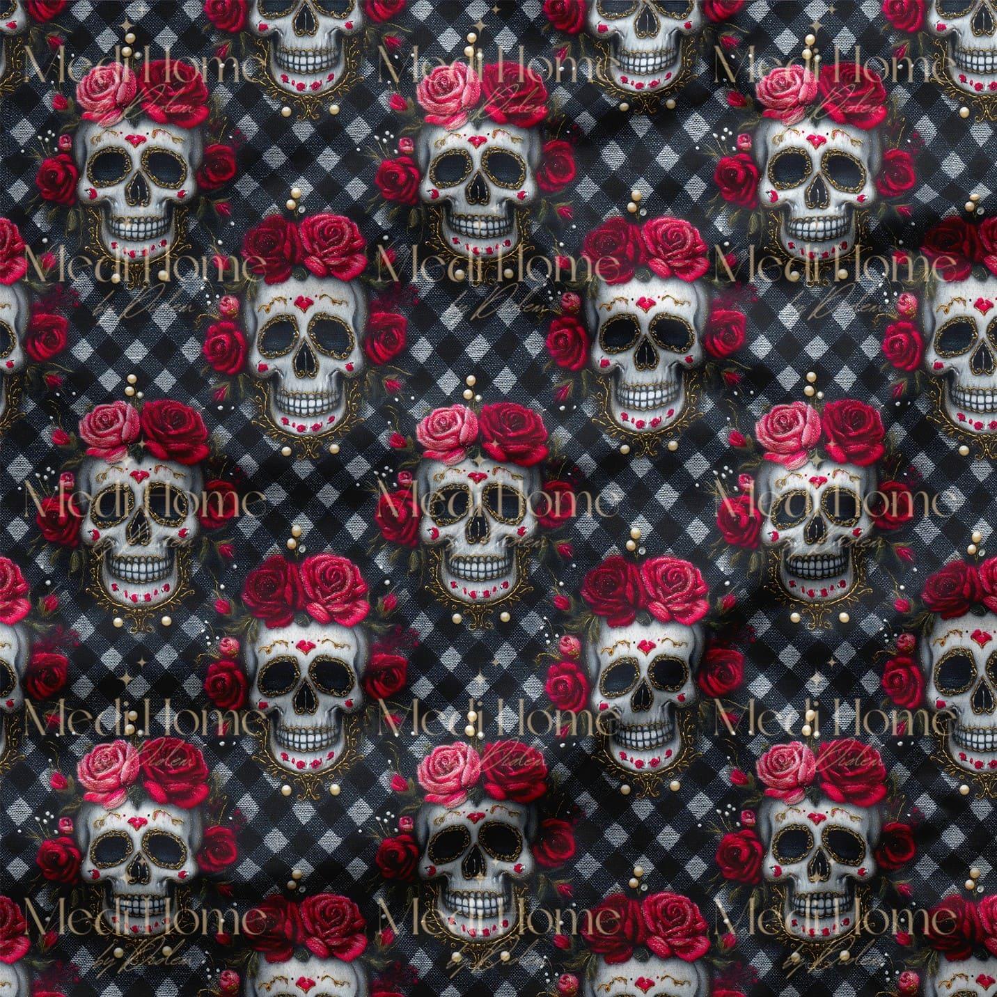 Siyah ve gri ekose zemin üzerinde parlayan kırmızı güllerle bezenmiş, nakış efektli 3 boyutlu kafatası motifleri ile hazırlanmış çarpıcı bir tasarım. Gotik dokunuşu ve barok ayrıntılarıyla dikkat çeken bu desen, sanatsal ve iddialı dekor projeleri için kusursuz bir seçimdir.