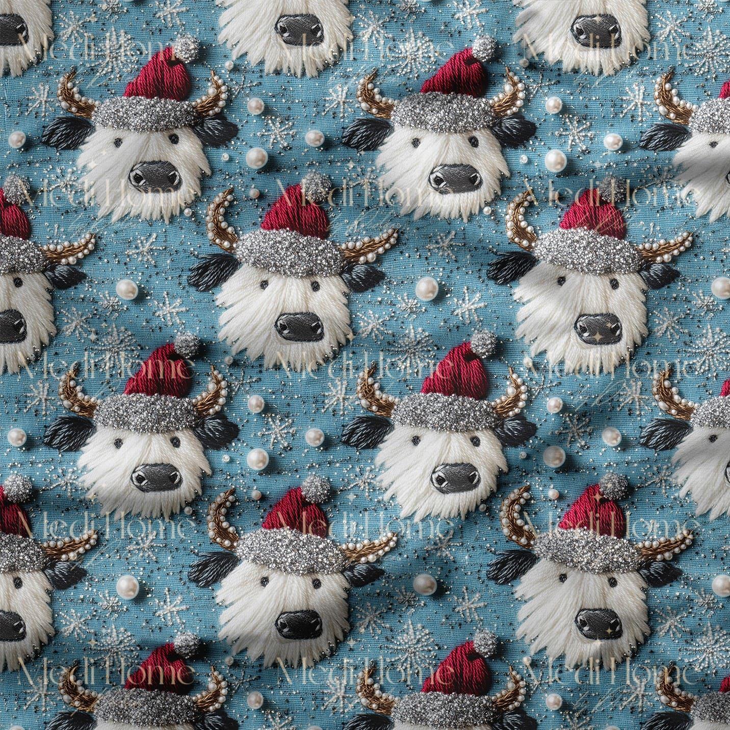 Beyazın huzuru, buz mavisinin ferahlığı ve sevimli kış dostlarının neşesi bu desende birleşiyor. Yumuşacık görünümlü beyaz tüylü dağ hayvanları, kırmızı Noel şapkaları ve ışıltılı gri bereleriyle kışın en sevimli yüzünü yansıtıyor. Boynuzlarına dokunan ışıltılar ve çevreyi süsleyen kar taneleri, nakış efektli 3 boyutlu baskıyla kumaşa adeta el işçiliği havası katıyor.