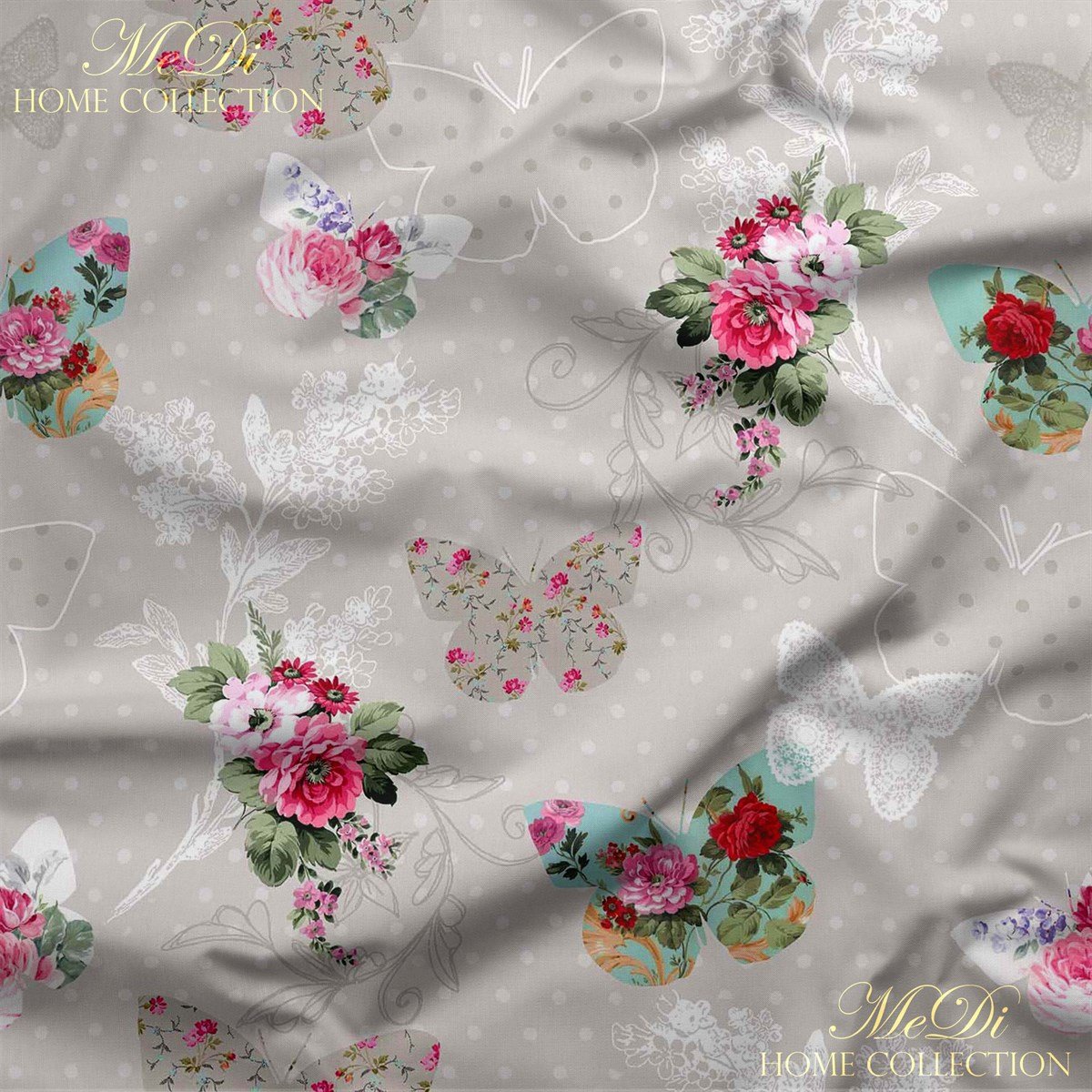 Tül gibi hafif, bahar gibi taze bir hisle sarmalanmış bu özel desen; kelebeklerin zarafetiyle çiçeklerin naifliğini buluşturuyor. Griye çalan açık zemin üzerine yerleştirilen beyaz dantelimsi çizgiler, nostaljik bir fonda kelebeklerin uçuşunu andırıyor. Her biri çiçeklerle bezenmiş kelebek figürleri; pembe, fuşya ve mint tonlarındaki çiçek buketleriyle harmanlanıyor.