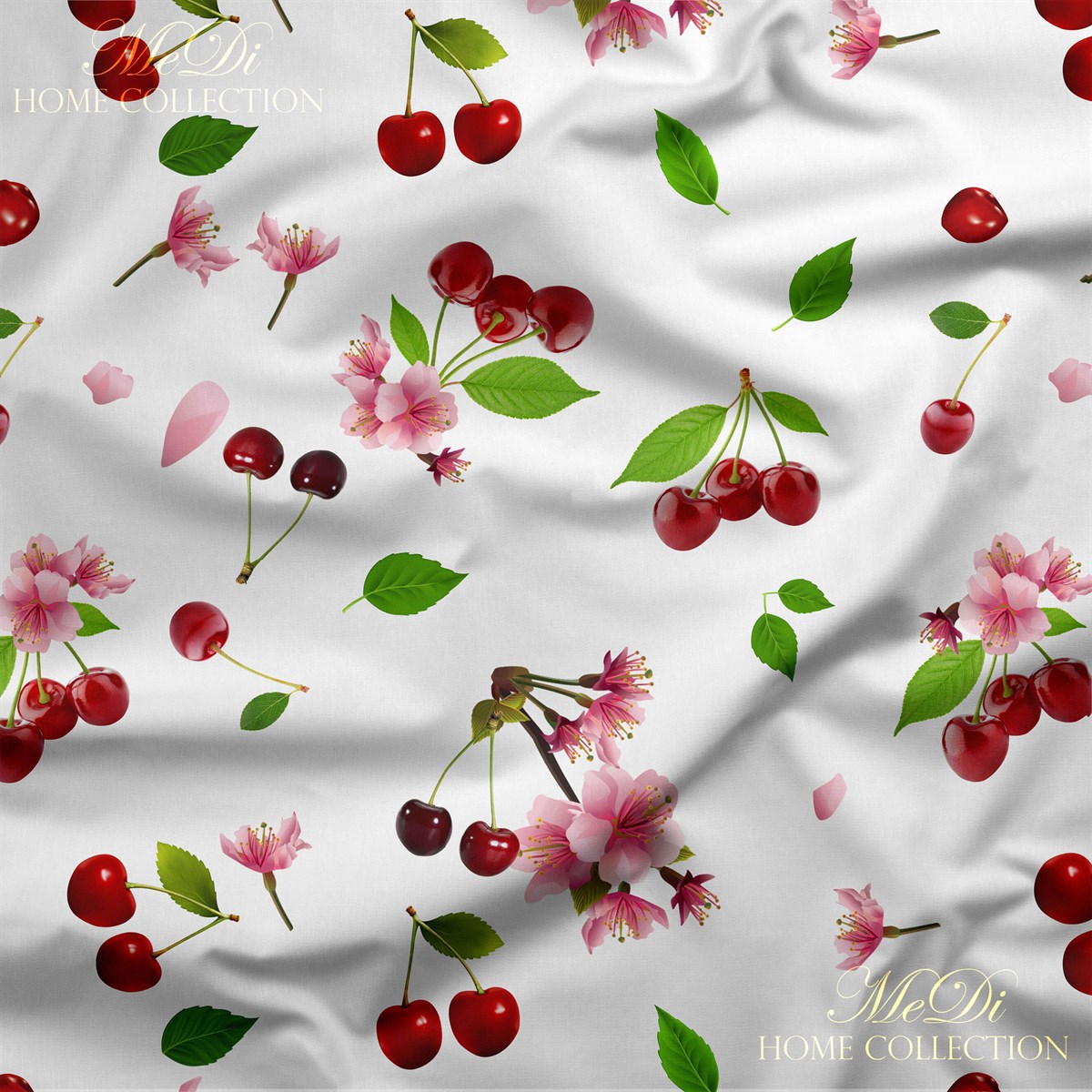 •    Desen beyaz zemin üzerine yerleştirilmiş kiraz meyveleri ve pembe kiraz çiçeklerinden oluşur