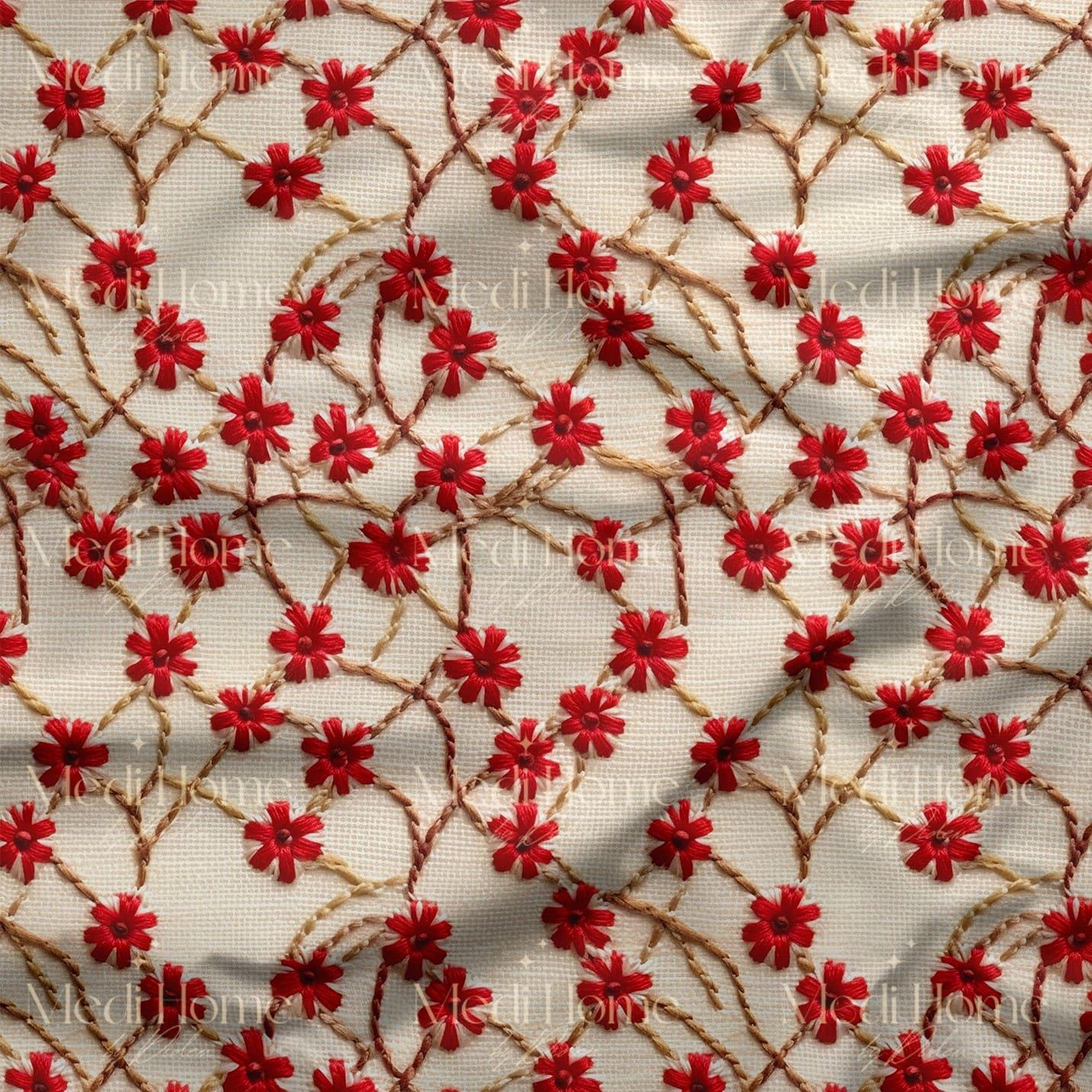 Kırmızı Çiçeklerin İplik Bahçesi Dijital Baskılı Kumaş