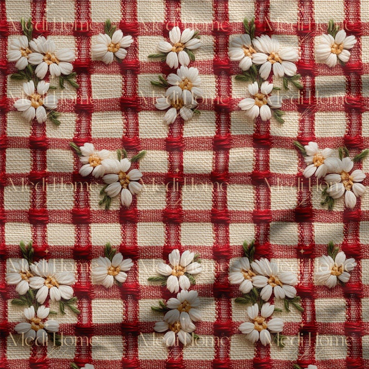 “Kırmızı Dama Üzerinde Bahar Papatyaları”, rustik dama desenini papatyaların taze zarafetiyle birleştiren romantik bir 3 boyutlu kumaş deseni. Kırmızı ve krem tonlarının sıcak uyumu, el işçiliğini andıran papatyalarla buluşarak hem nostaljik hem canlı bir atmosfer oluşturur. Country ve vintage tarz sevenler için tasarlanan bu kumaş, hem estetik hem dayanıklıdır.