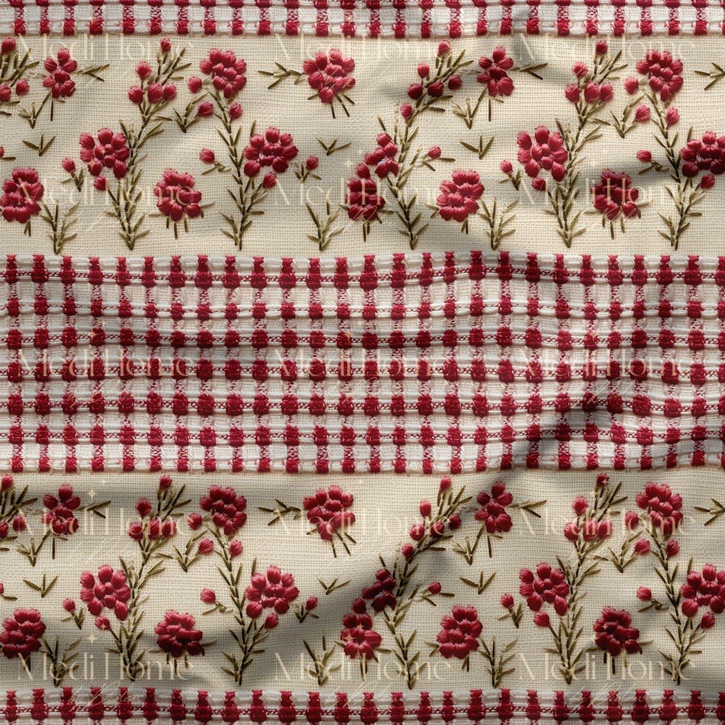 “Kırmızı Dama Üzerinde Çiçekli Yollar”, geleneksel dama düzenini zarif kır çiçekleriyle buluşturan romantik bir 3 boyutlu kumaş deseni. Kırmızı-beyaz dama zemin, aralarda uzanan minik pembe-kırmızı tomurcuk dallarıyla birleşerek kumaşa adeta işlenmiş bir el nakışı hissi kazandırıyor. Dama çizgileri düzenli bir ritim oluştururken, çiçek dallarının doğal akışı bu desene sıcaklık ve zarafet katıyor.
