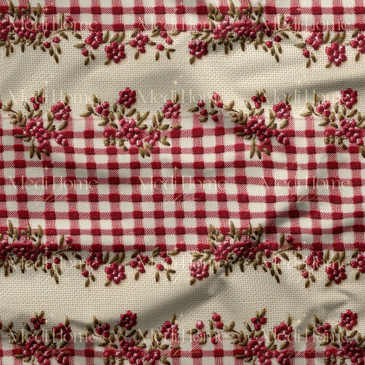 “Kırmızı Dama Üzerinde Kış Buketleri”, klasik dama deseninin rustik sıcaklığını, el işçiliği hissi veren 3 boyutlu çiçek buketleriyle buluşturuyor. Krem ve kırmızı tonlarının dengesiyle oluşan bu nostaljik yüzey, kışın sıcak dokunuşlarını evinizin her köşesine taşır. Kumaşın üzerinde yer alan çiçek motifleri ve ince yaprak detayları, tıpkı nakış gibi derin bir doku hissi yaratır.