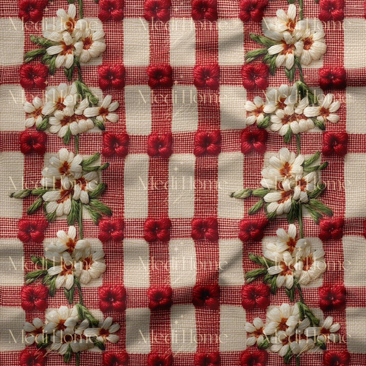 Kırmızı Dama Üzerinde Papatya Bahçesi Dijital Baskılı Kumaş (redtowel012)
