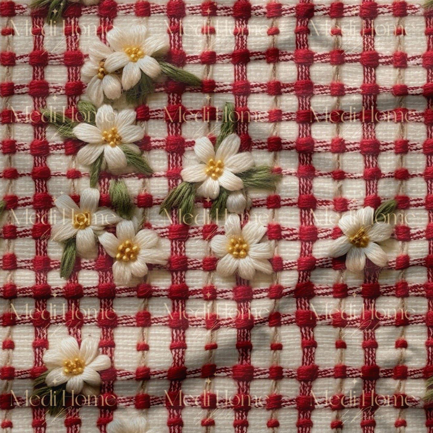 “Kırmızı Karelerde Papatya Dansı”, nostaljik dama desenine el emeğini andıran 3 boyutlu papatya işlemeleriyle hayat veren sıcacık bir tasarım. Kırmızı ve krem tonlarının klasik buluşmasına, beyaz papatyalar ve yeşil yapraklar zarif bir doğallık katıyor. Bu özel 3 boyutlu efekt, kumaşa hem derinlik hem dokunsal bir zenginlik kazandırırken, mikropetek dokuma yapısı tok, dayanıklı ve uzun ömürlü bir his bırakıyor.