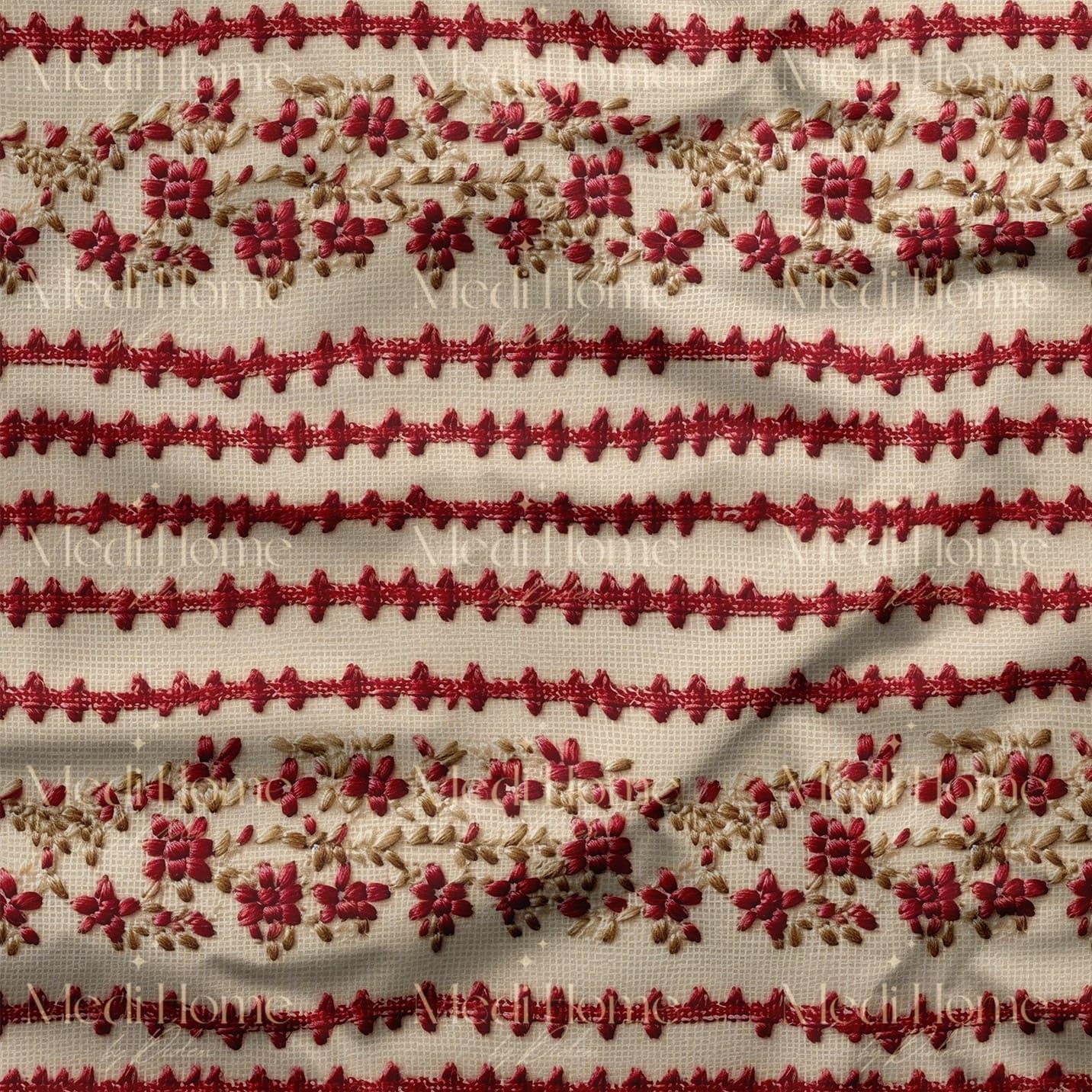 Kırmızı Nakışların Zarif Şeridi Dijital Baskılı Kumaş
