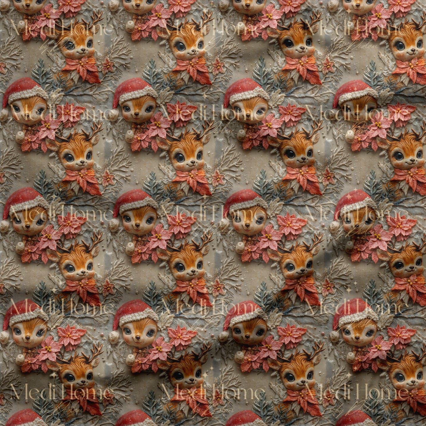 Yılbaşı ruhunu zarafet ve sevimlilikle buluşturan bu desen, kışın en büyülü anlarını evinize getiriyor. Poinsettia çiçekleri arasında parlayan minik geyikler ve Noel şapkalarıyla süslenmiş tatlı yüzler, masalsı bir kış atmosferi oluşturuyor. 3 boyutlu efektli detaylar sayesinde her figür canlı ve dokunulabilir bir hissiyat veriyor.  Sofralarınıza, dekoratif ürünlerinize ve yılbaşı kutlamalarınıza sıcacık bir dokunuş katacak.