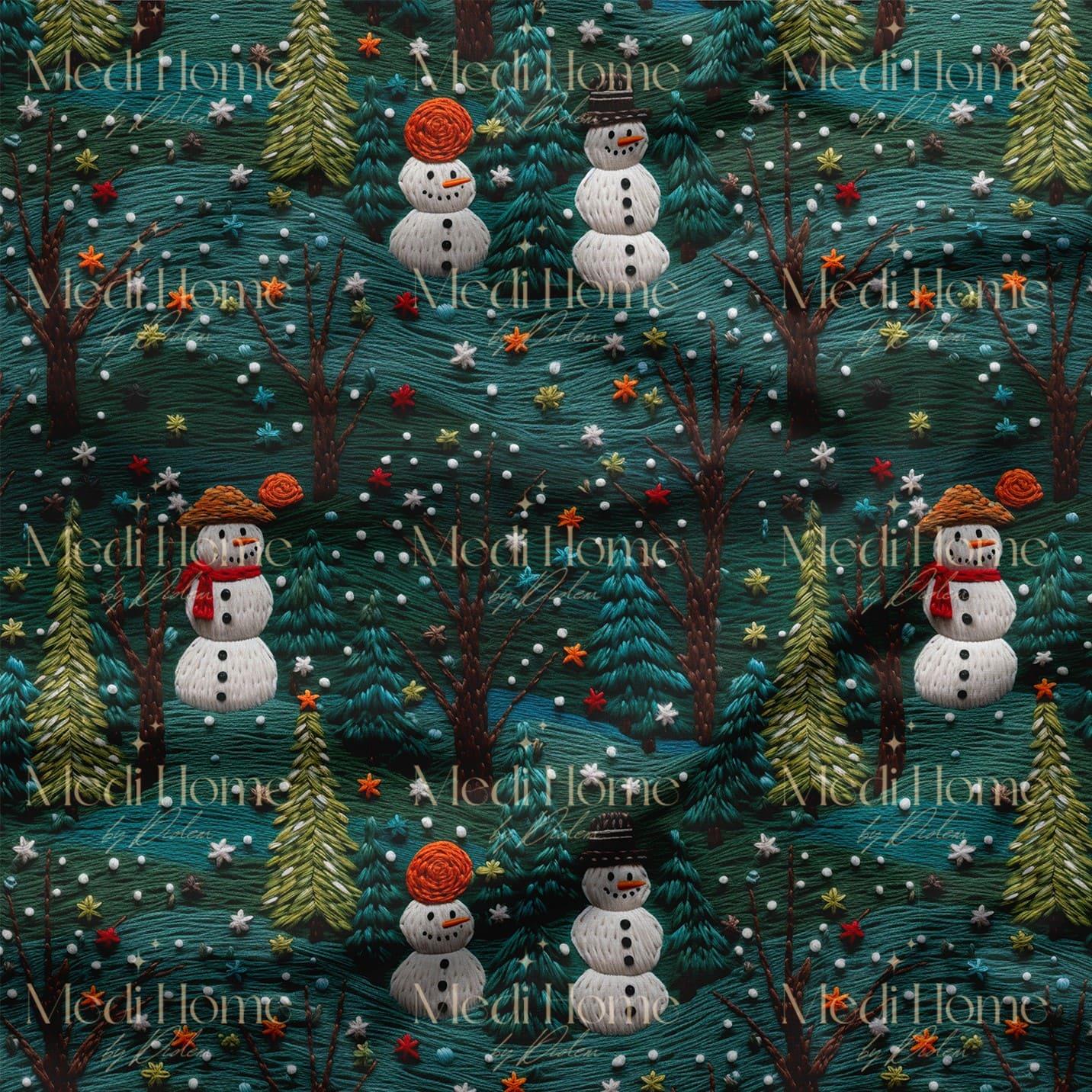 Kış Ormanında Kardan Adamlar Dijital Baskılı Kumaş (Xmax011)