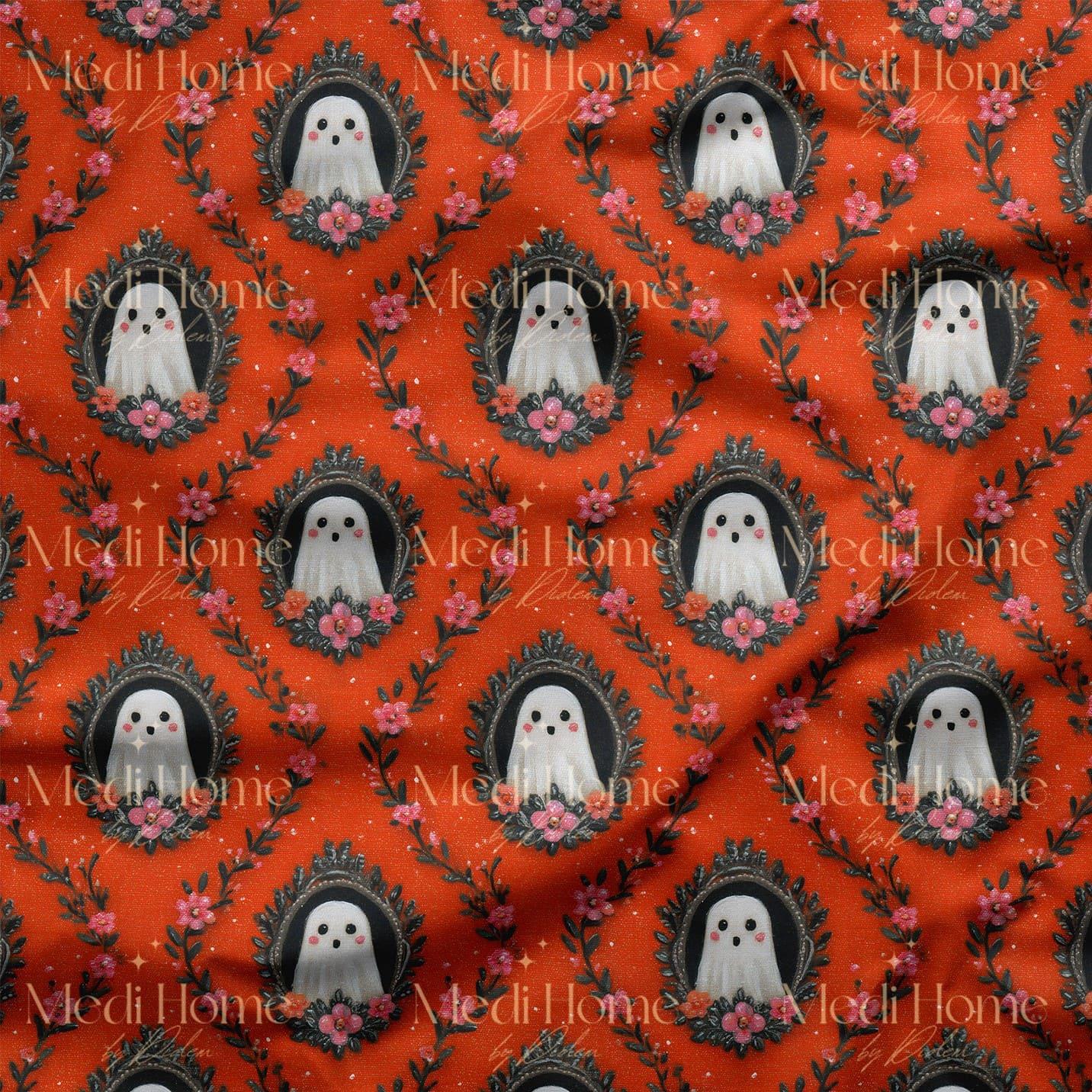 Canlı mercan-kırmızı zemin üzerinde 3 boyutlu nakış efektiyle çerçevelenmiş sevimli beyaz hayaletler ve pembe çiçek detayları, bu desene romantik ve neşeli bir hava katıyor. Hem eğlenceli hem de zarif dokunuşuyla evinizin en göz alıcı parçası olacak.