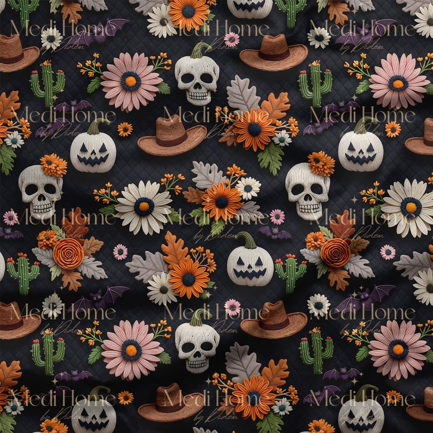 “Kovboy Şapkalarıyla Çiçekli Halloween”, klasik Cadılar Bayramı ruhunu bohem, batı esintili bir 3 boyutlu hikâyeye dönüştürüyor. Siyah quilt dokulu fon üzerinde yer alan beyaz balkabakları, çiçeklerle süslenmiş kafatasları, kaktüsler, mor yarasalar ve kovboy şapkalarıyla birleşerek benzersiz bir batı-Halloween sentezi yaratıyor. Turuncu, bej, mor ve yeşil tonlarıyla harmanlanan bu desen, hem rustik hem de eğlenceli bir enerji taşıyor.