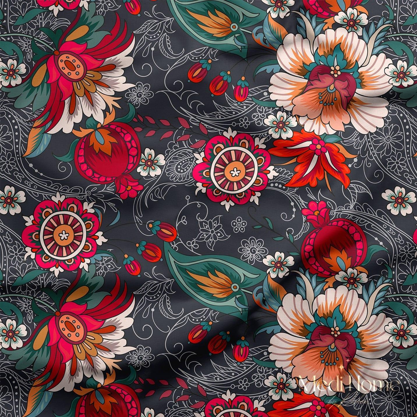 Koyu Zeminde Nar ve Etnik Çiçeklerin Dansı Dijital Baskılı Kumaş (ALTIN BAHAR 41)